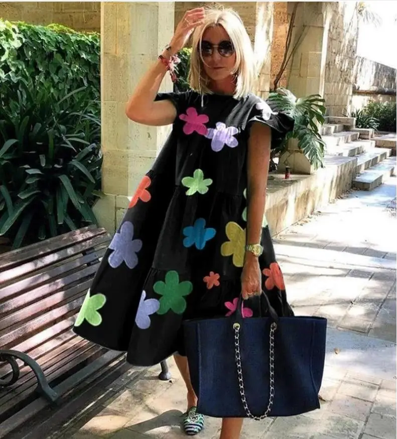 Women Vintage Floral Print Loose A-Line Dress 2020 Summer O-neck Petal Short Sleeve Dress Elegant Casual Party Dress 2XL Vestido