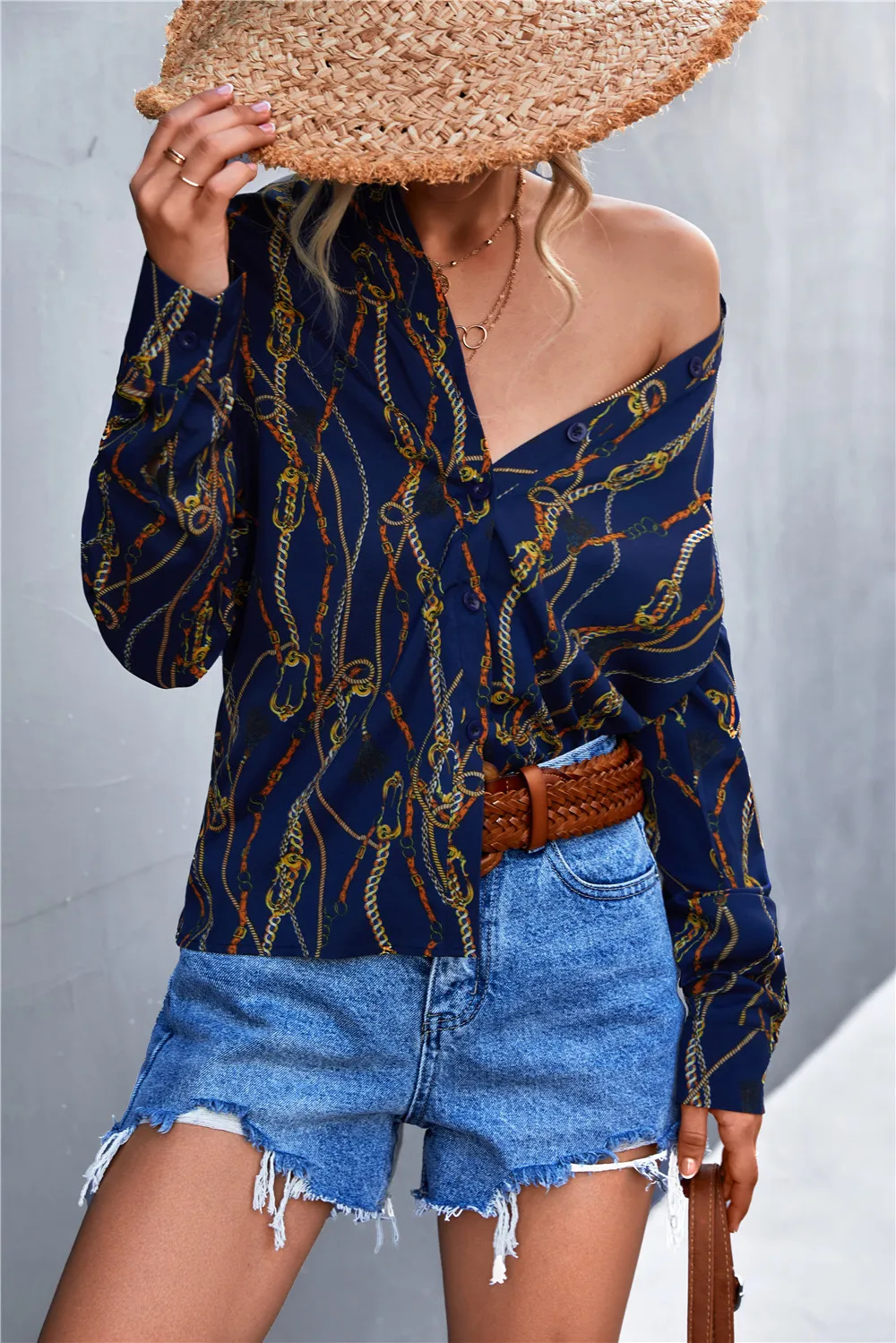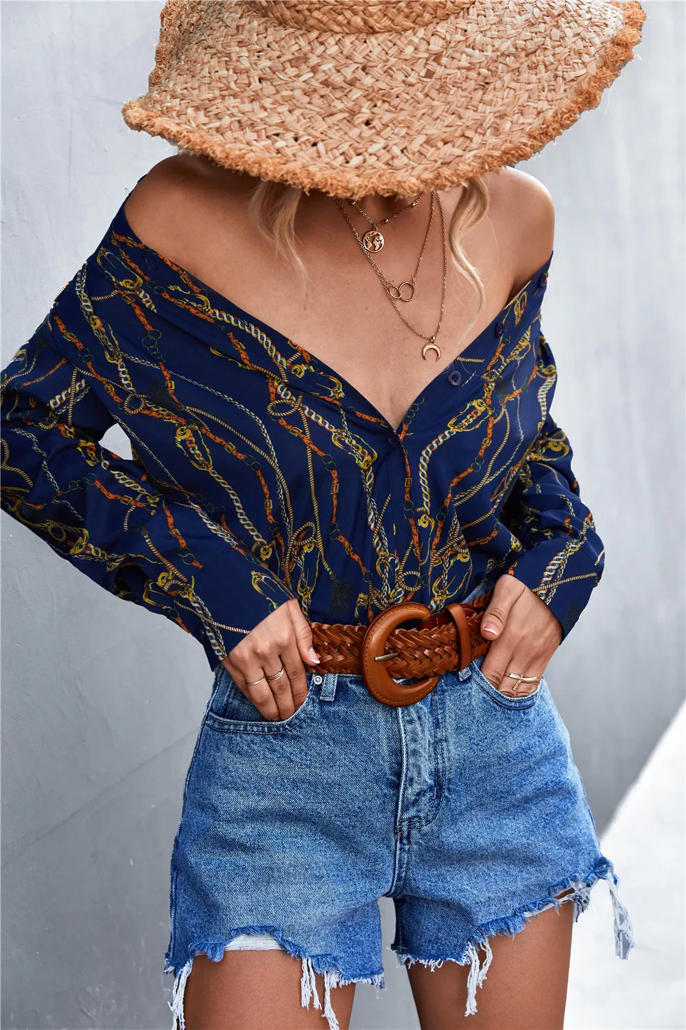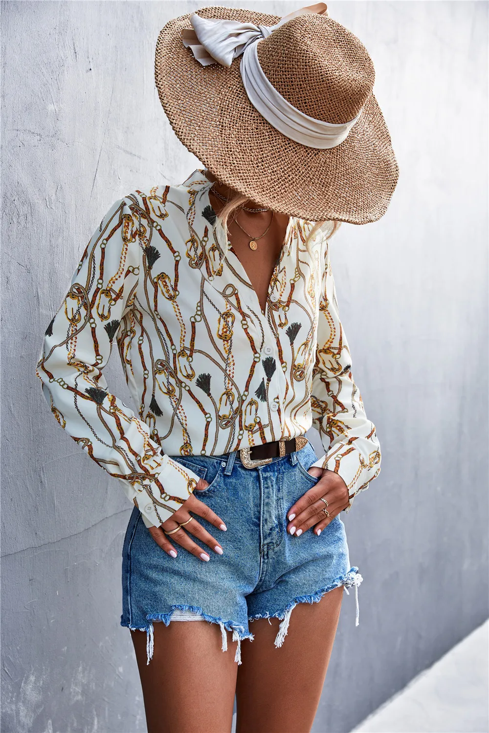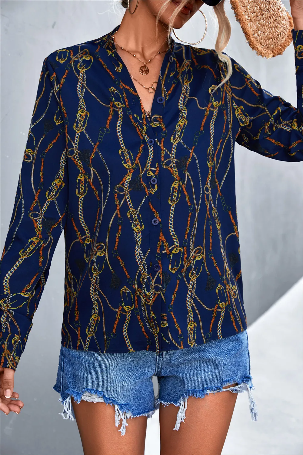 Women's 2022 Spring New Stand Collar Long Sleeve Chain Shirt Office Lady Fashion Single-breasted Blouse Tops Femme Blusas Shirts