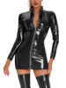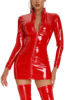 Womens Black Red Wetlook Patent Leather Dress Pole Dance Raves Party Outfit Zipper Stand Collar Wet Look Long Sleeve Clubwear