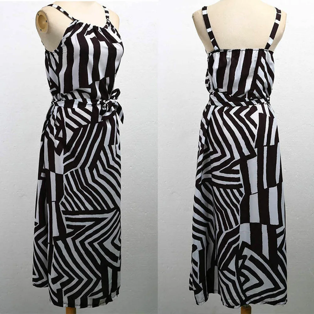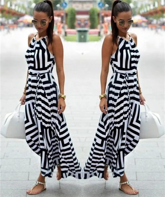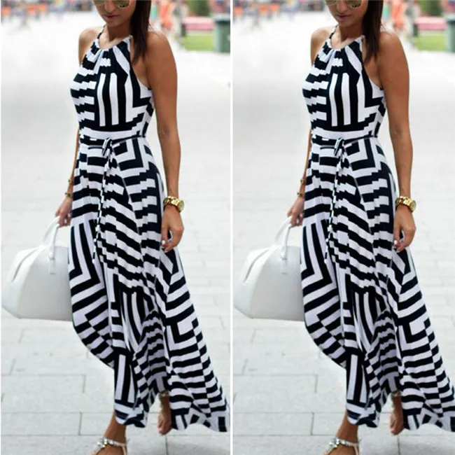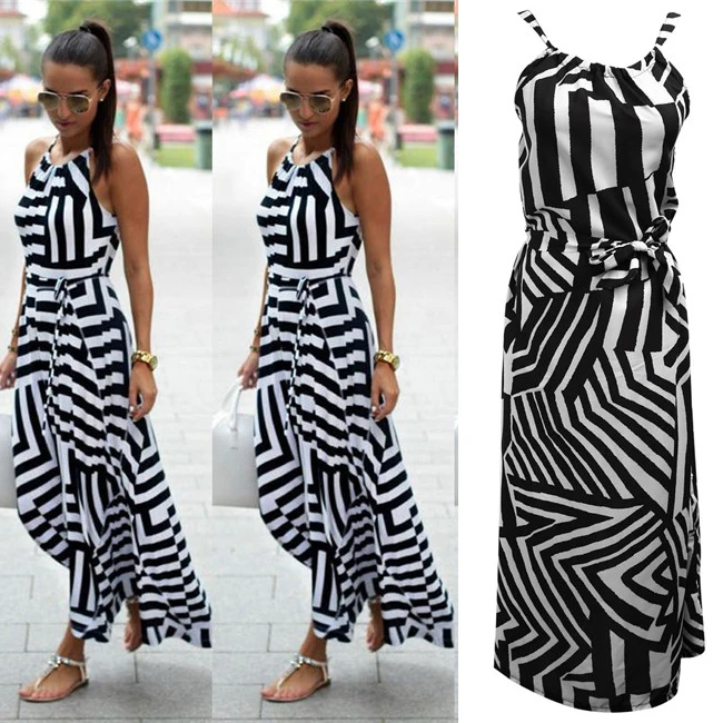 Womens Black White Strappy Maxi Dress Boho Summer Beach Long Maxi Evening Party Dress
