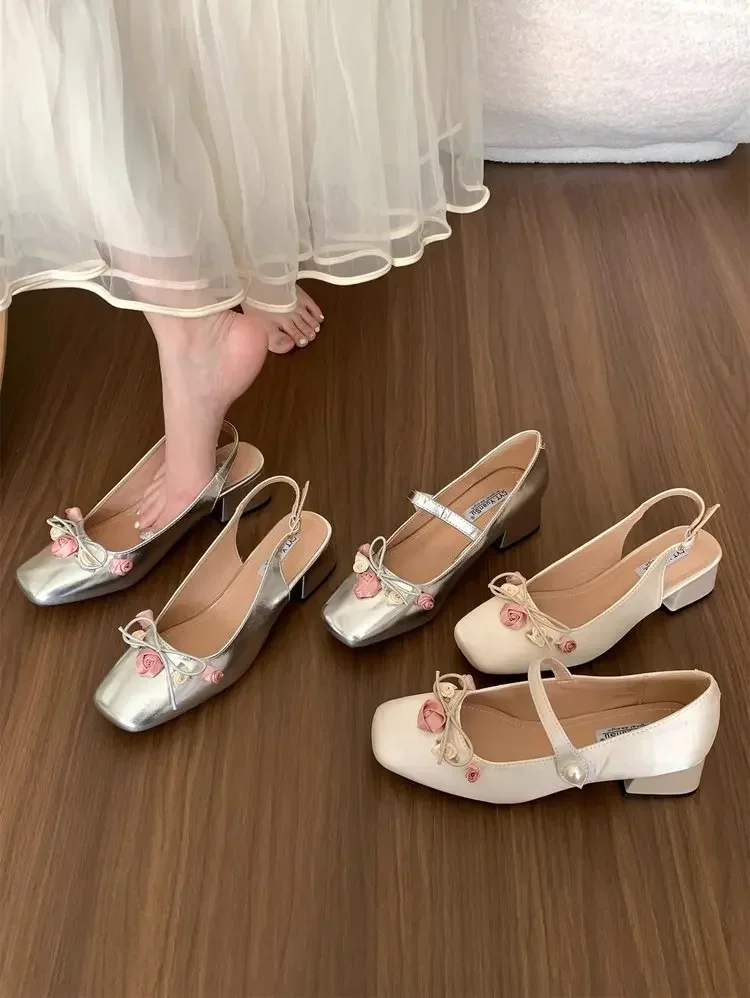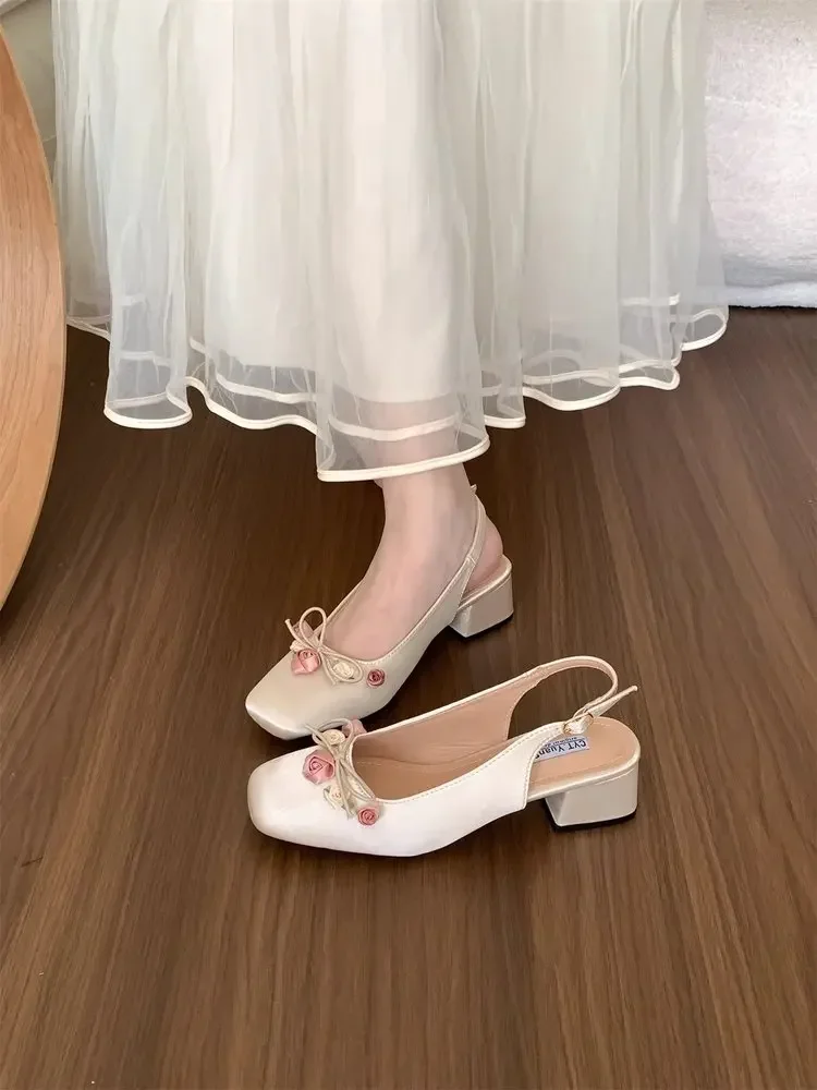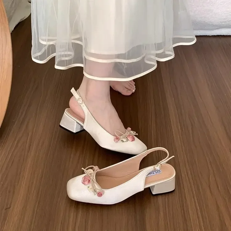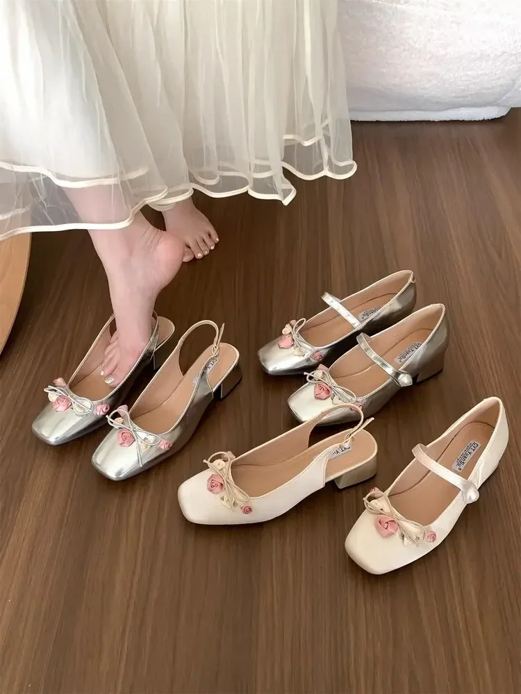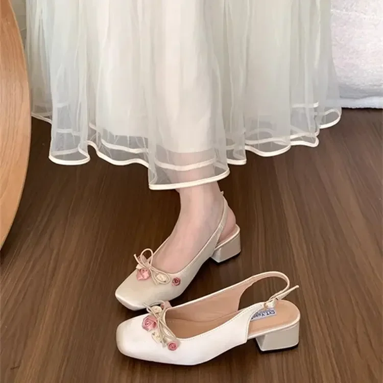 Women’s Bow Single Shoes Spring Summer New Chunky Mid Heels Brand Slippers Fashion Dress Square Toe Thick Heel Mary Jane Sandals