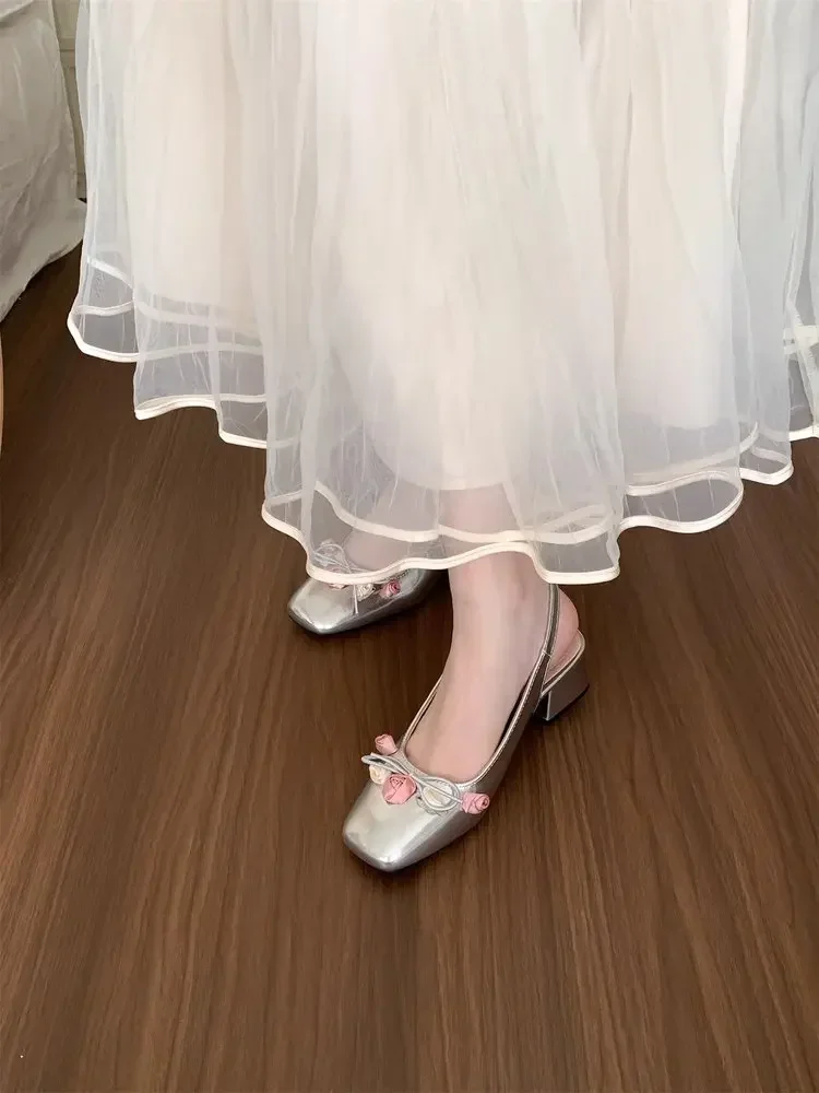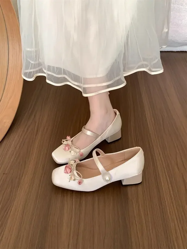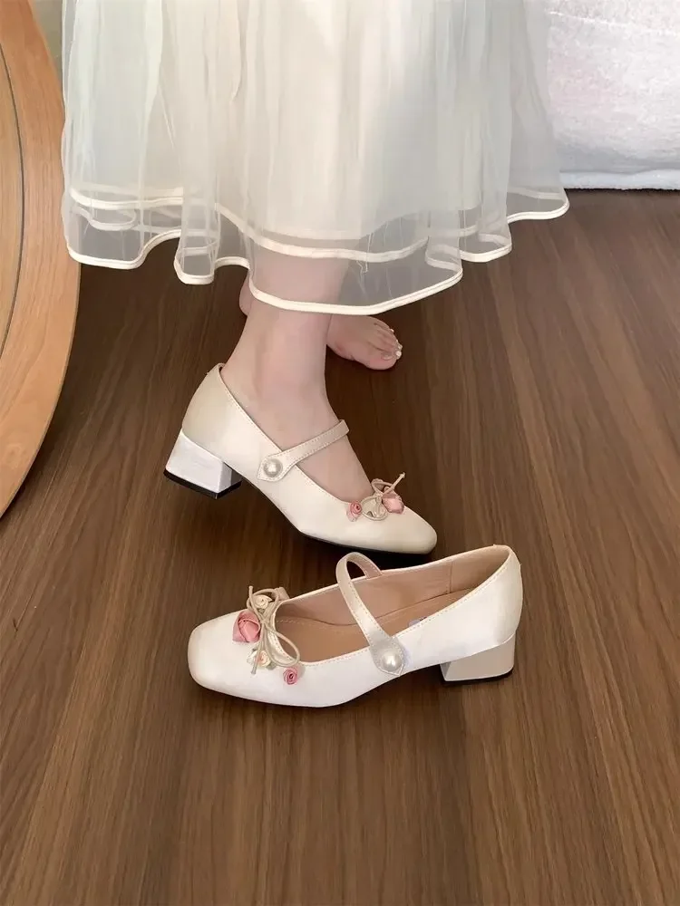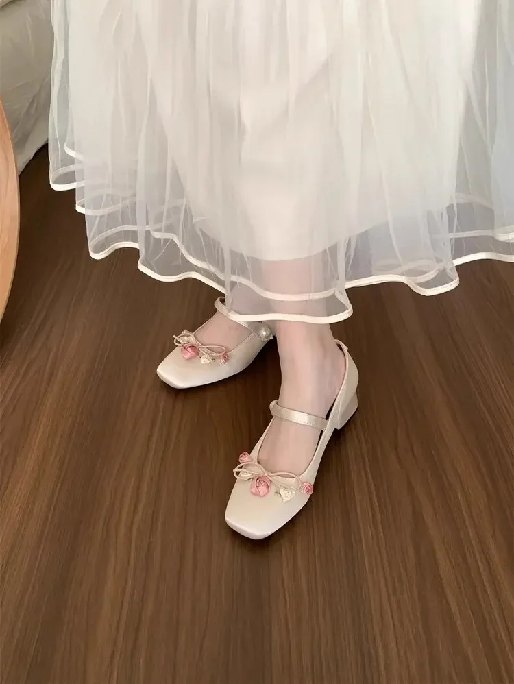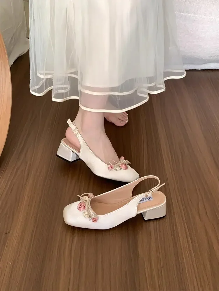 Women’s Bow Single Shoes Spring Summer New Chunky Mid Heels Brand Slippers Fashion Dress Square Toe Thick Heel Mary Jane Sandals