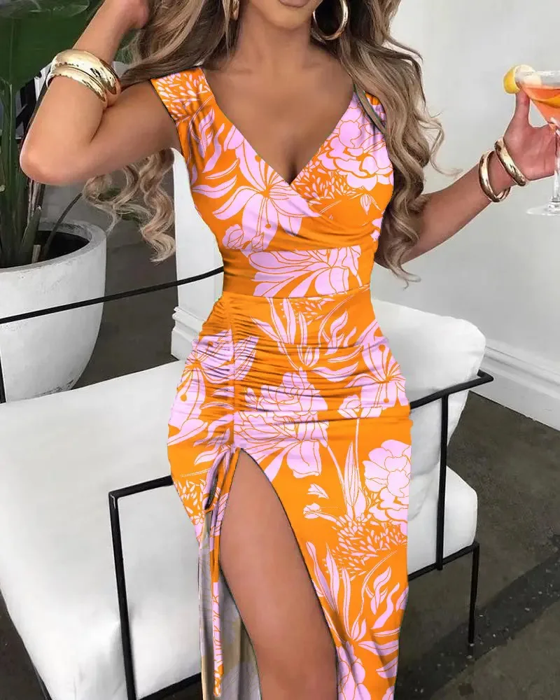 Women's Fashion Sexy High Slit Deep V Neck Tight Waist Dress Summer New Ladies Pullover Print Sleeveless Drawstring Long Dress