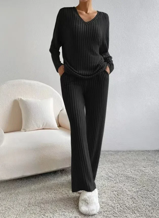 Women’s Pajamas Autumn Winter New Casual Straight Pants Pullover Sleepwear Loose V Neck Knitted Home Wear Two Piece Loungewear