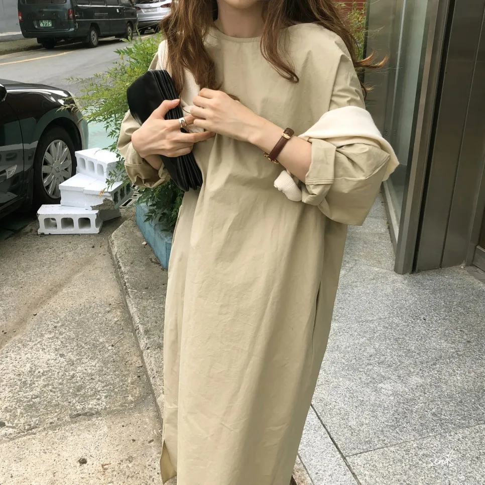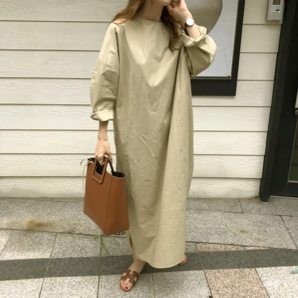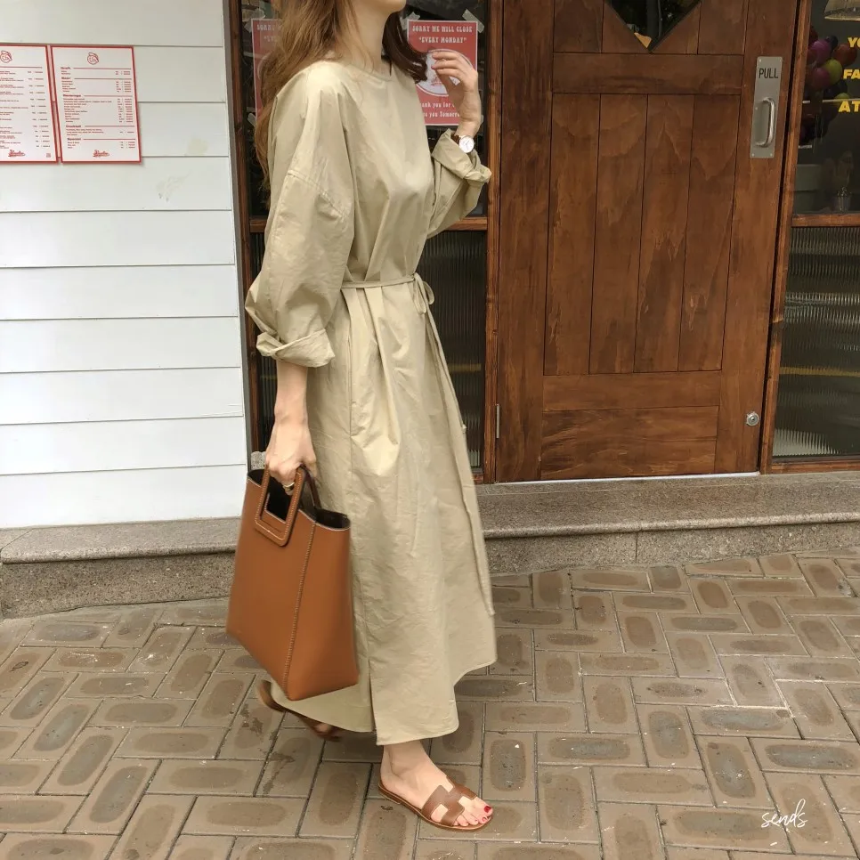 Women'S Round Neck Long Sleeve Slit Light Green Belt Pocket Cotton And Linen Casual Loose Long Skirt Solid Color