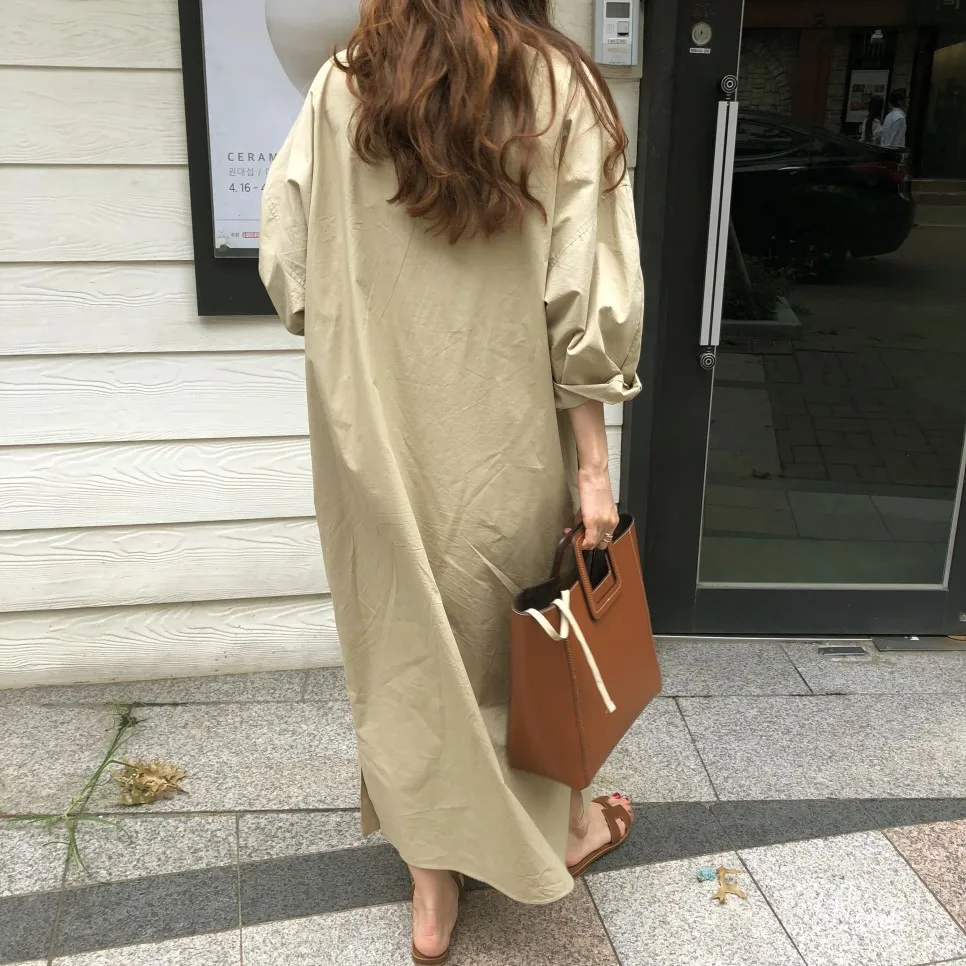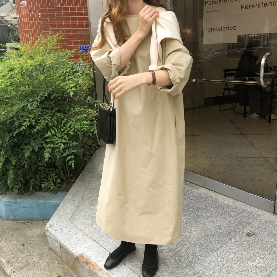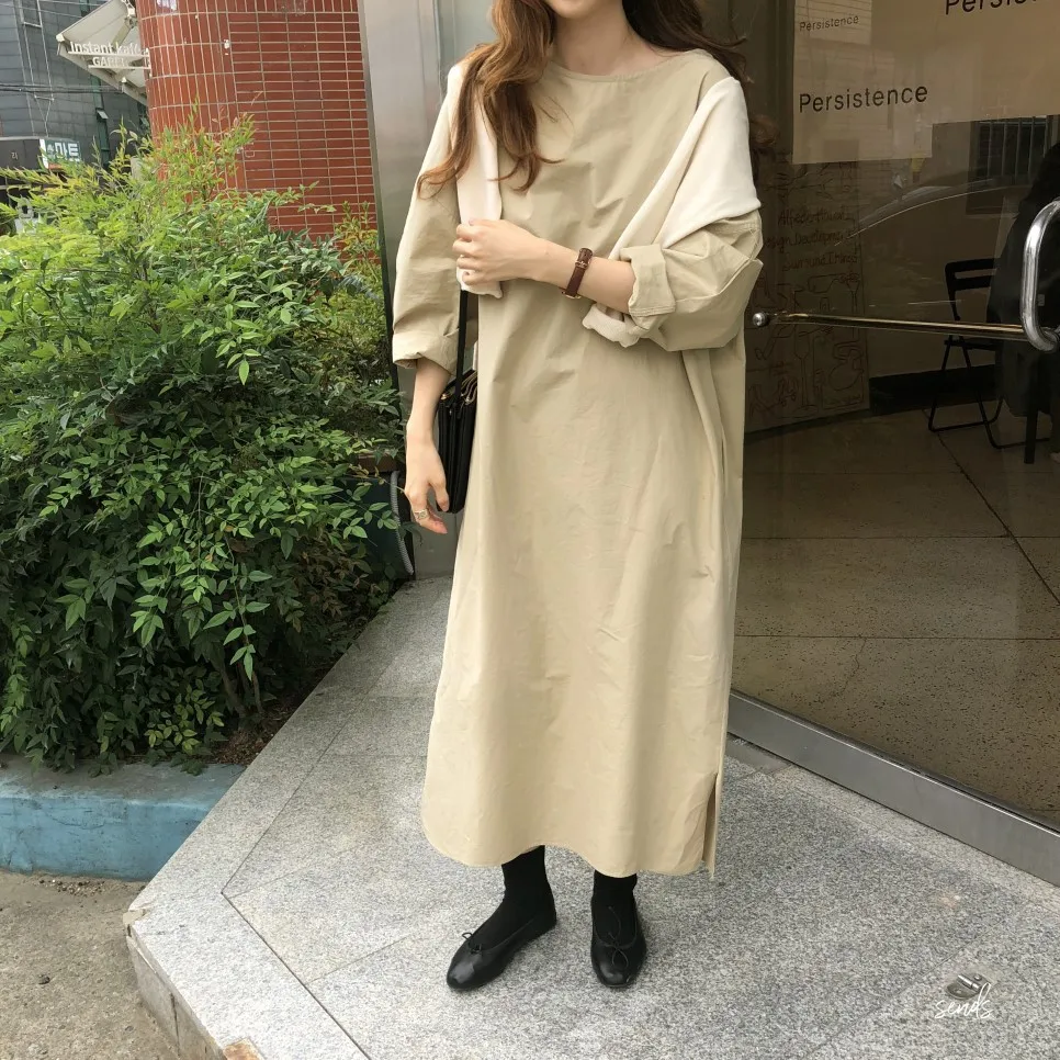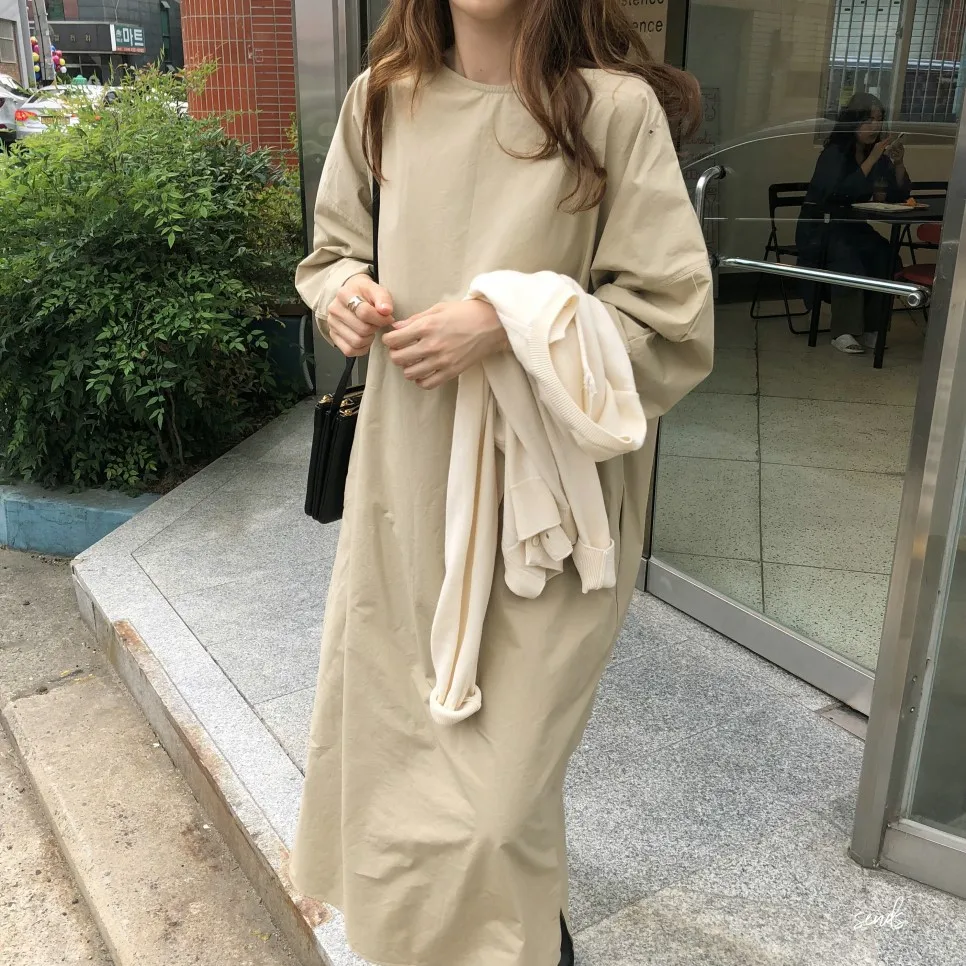 Women'S Round Neck Long Sleeve Slit Light Green Belt Pocket Cotton And Linen Casual Loose Long Skirt Solid Color
