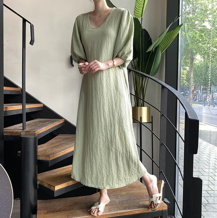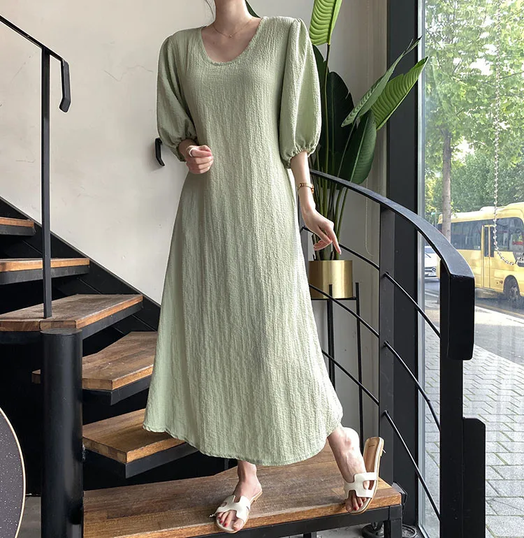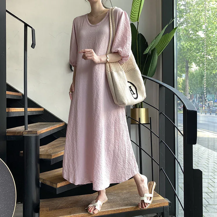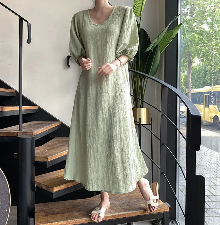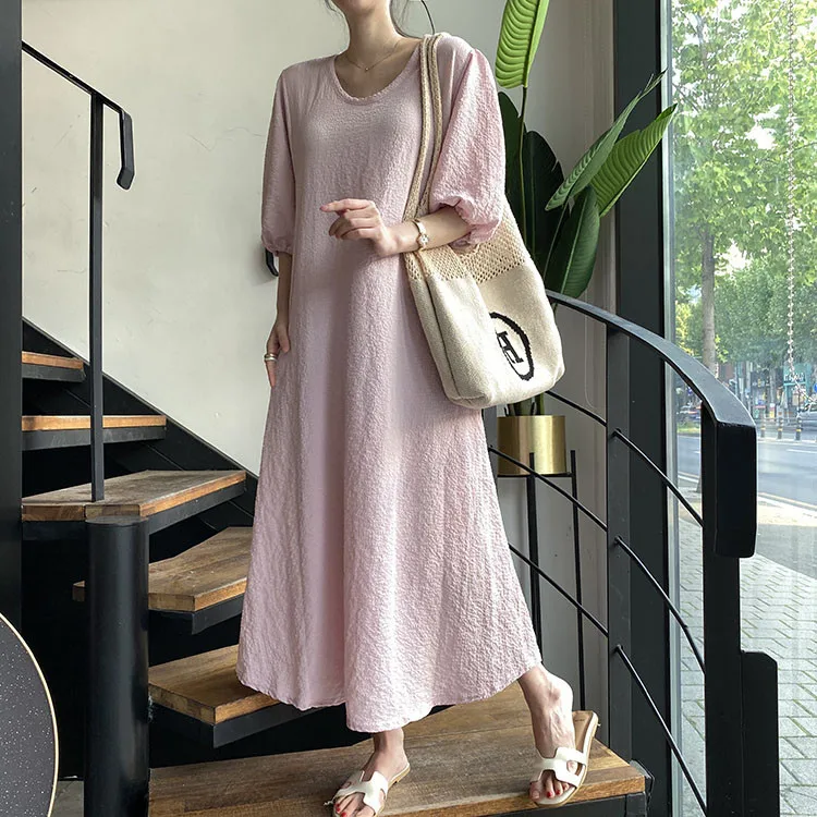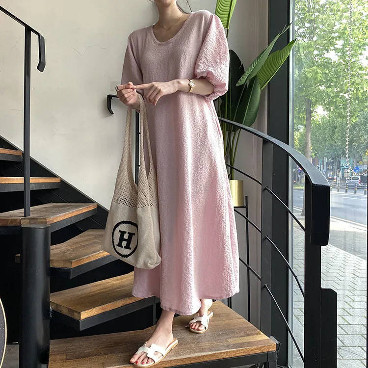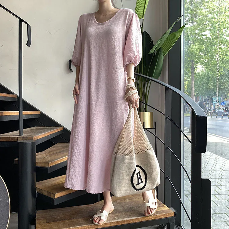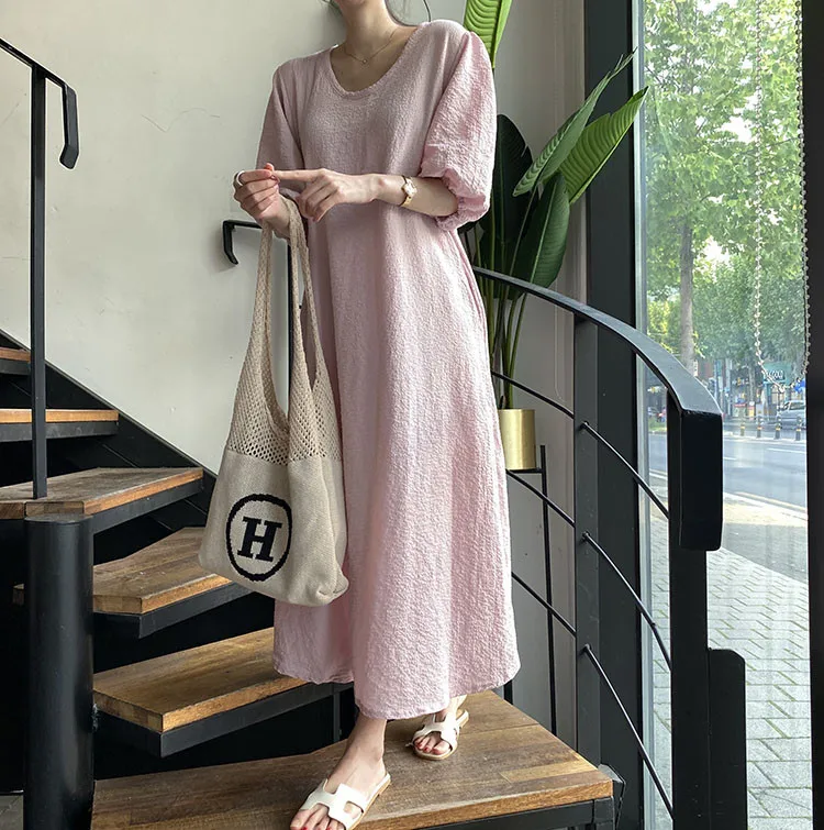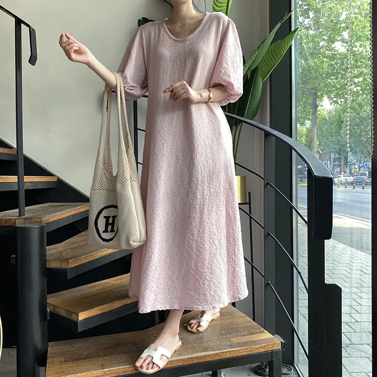 Women'S Round Neck Puff Sleeves With Pockets Solid Color Bubble Cotton Casual Loose Long Skirt
