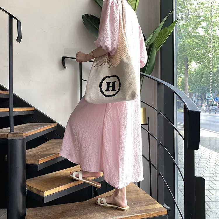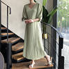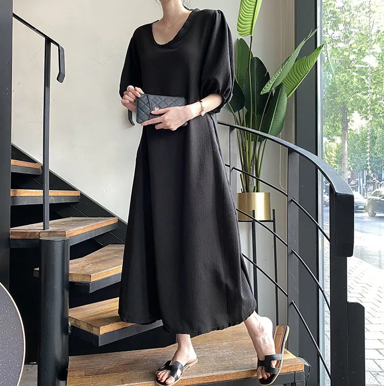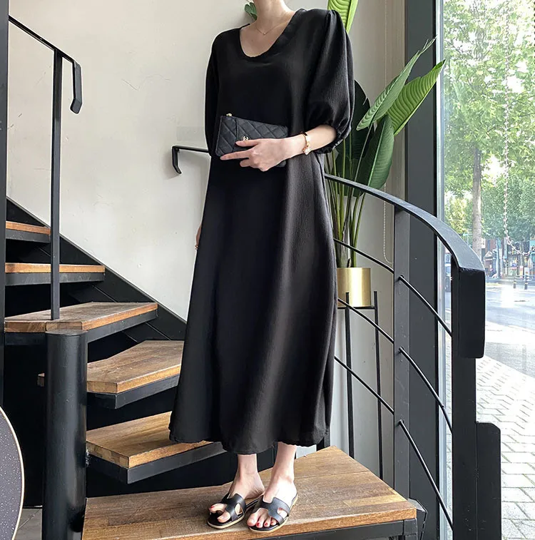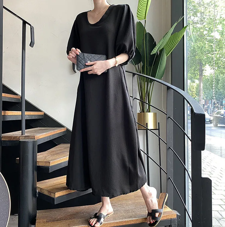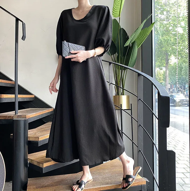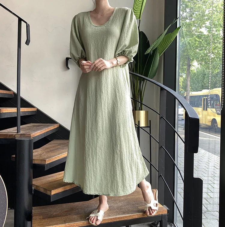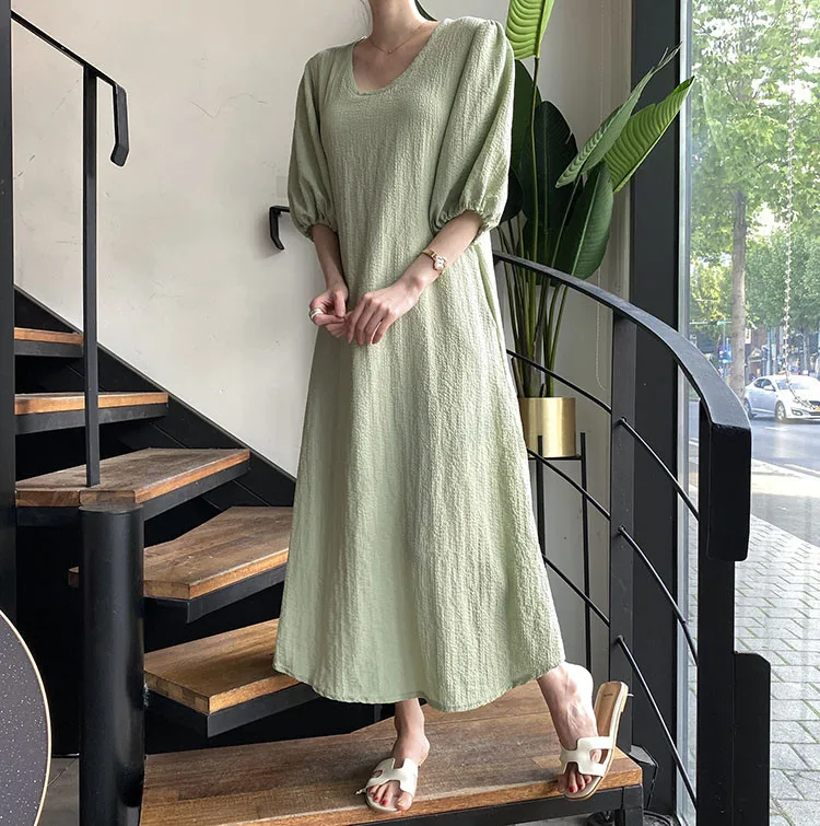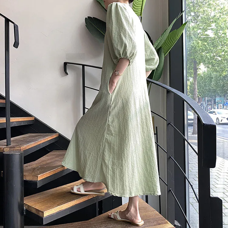 Women'S Round Neck Puff Sleeves With Pockets Solid Color Bubble Cotton Casual Loose Long Skirt