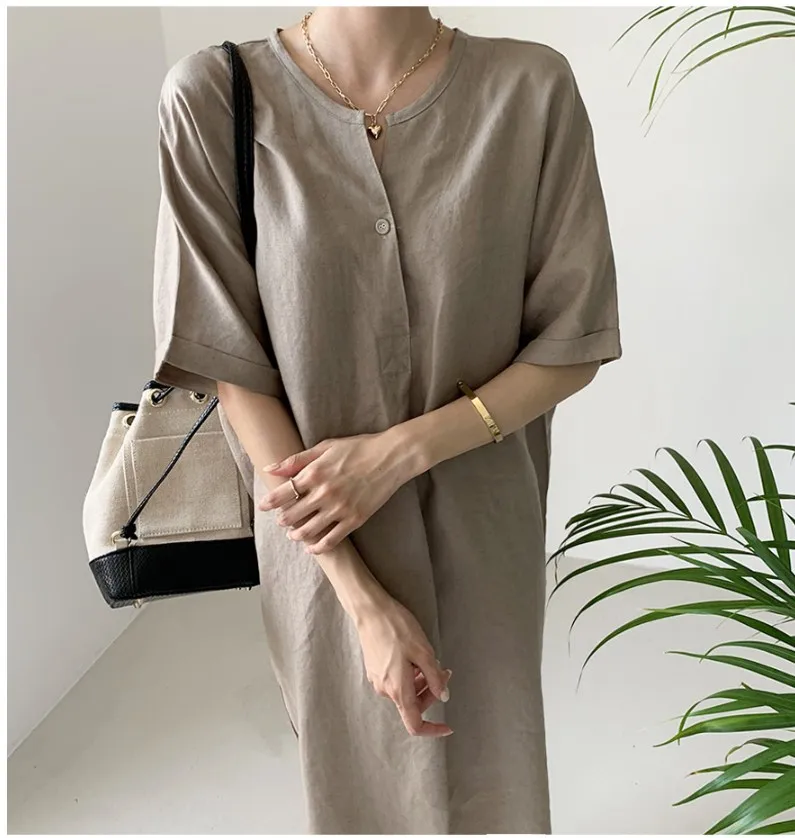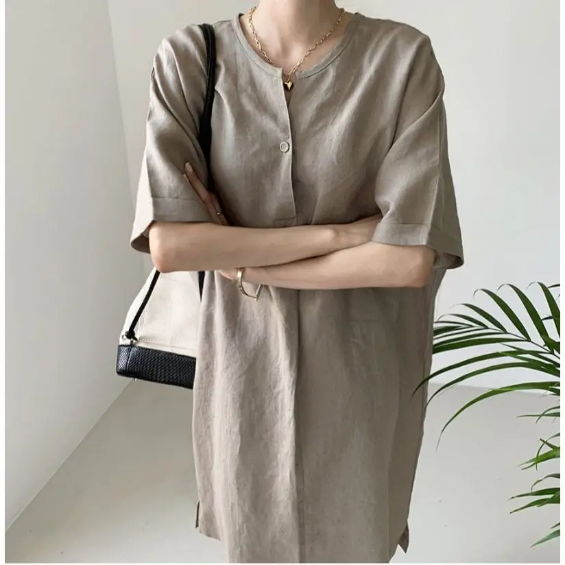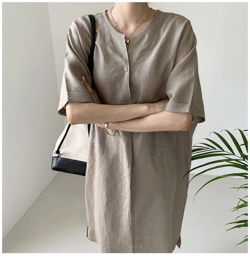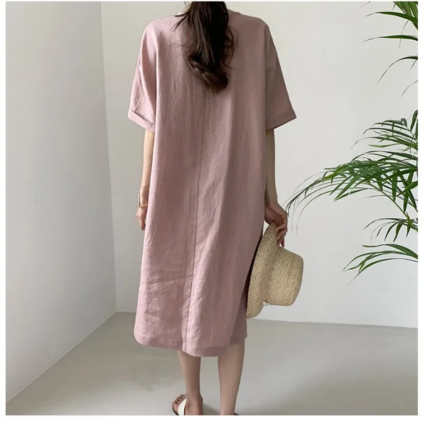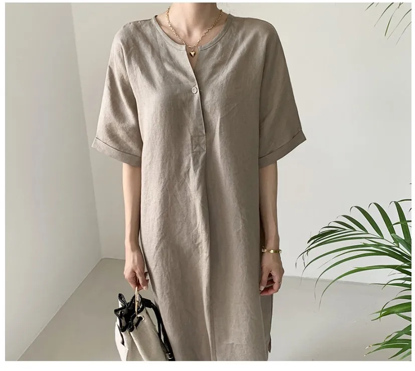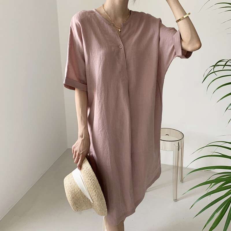 Women'S Round Tie Button Short-Sleeved Split Lavender Cotton And Linen Series Casual Loose Skirt