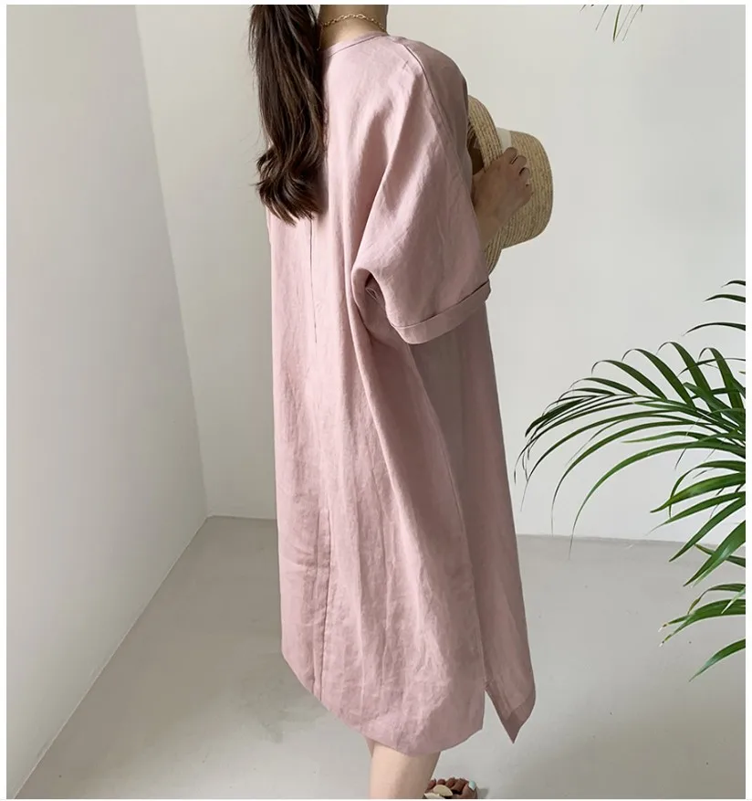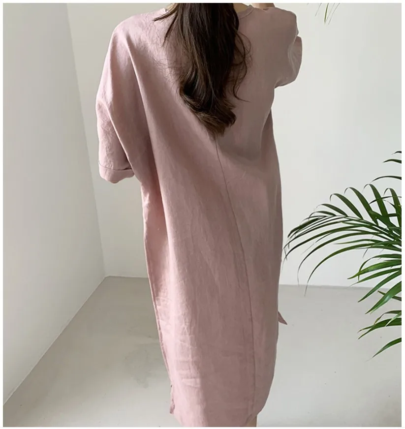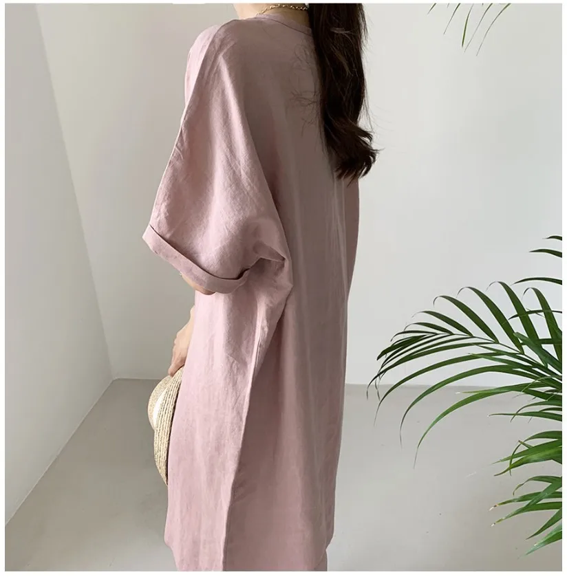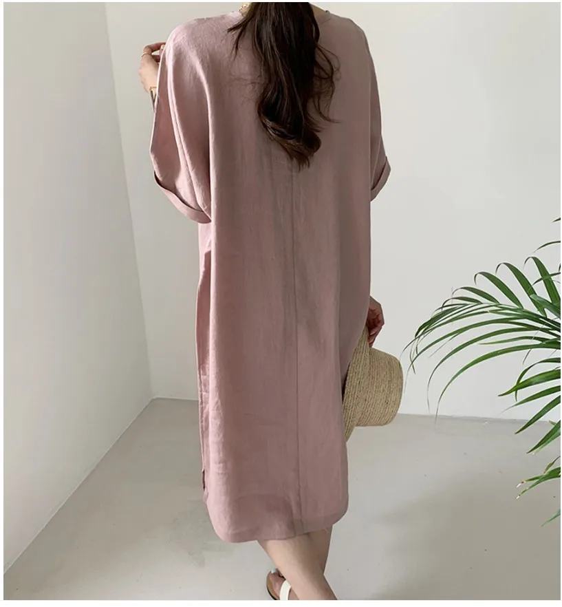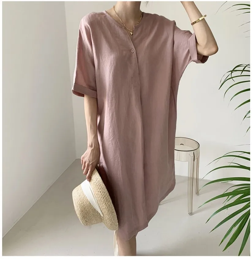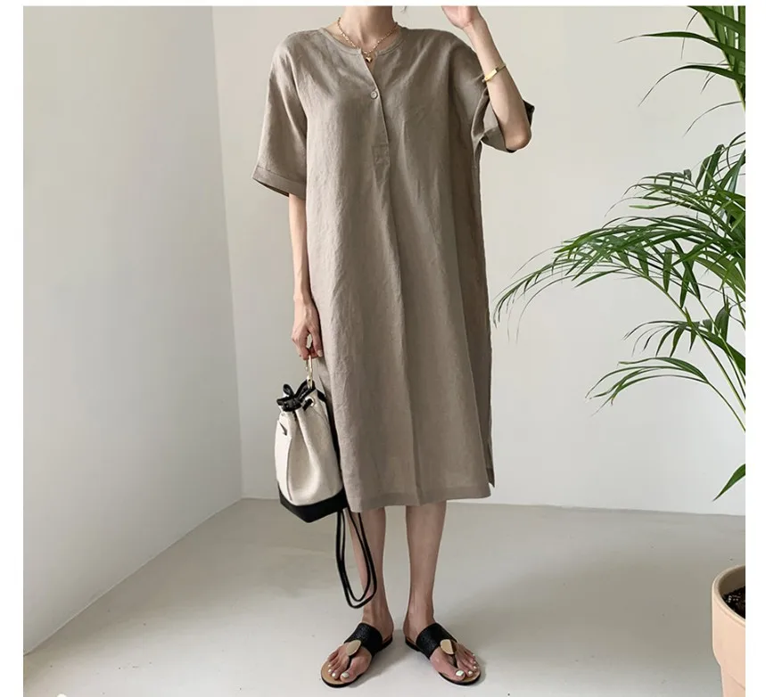 Women'S Round Tie Button Short-Sleeved Split Lavender Cotton And Linen Series Casual Loose Skirt