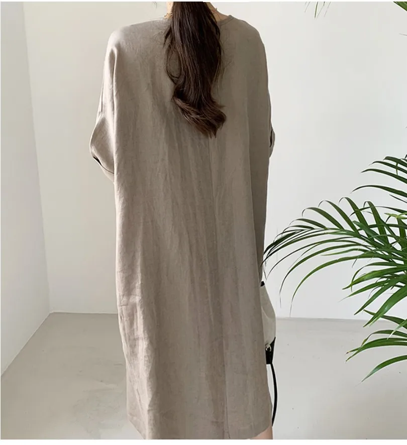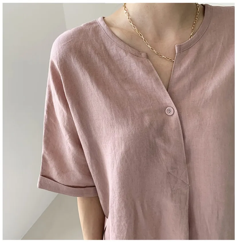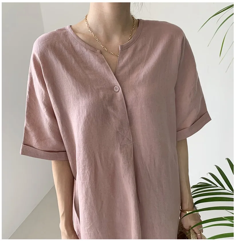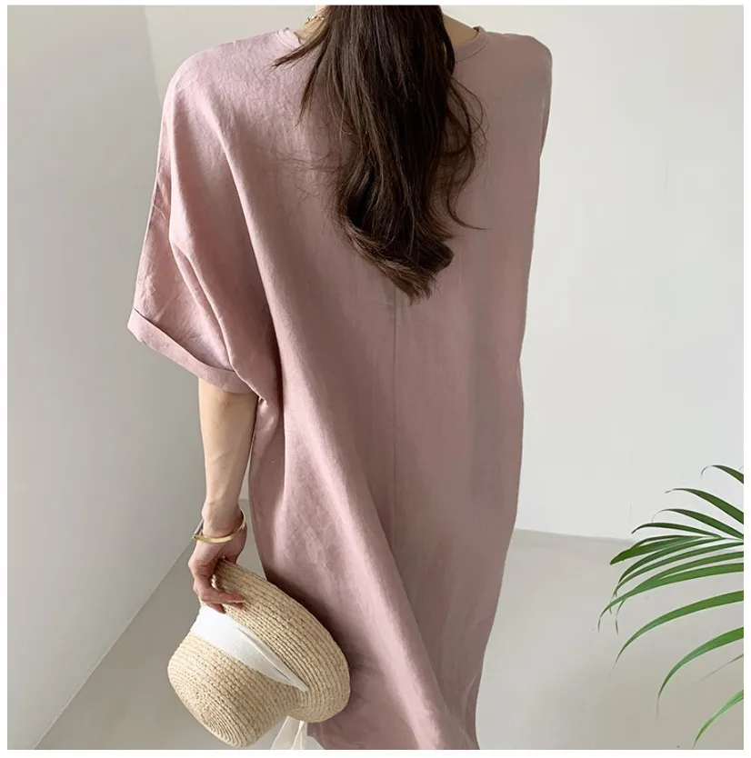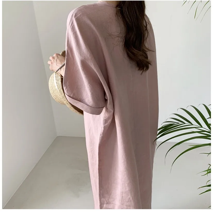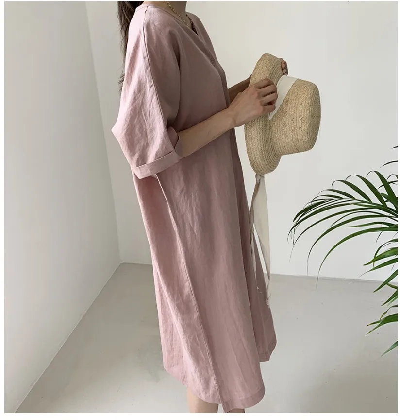 Women'S Round Tie Button Short-Sleeved Split Lavender Cotton And Linen Series Casual Loose Skirt