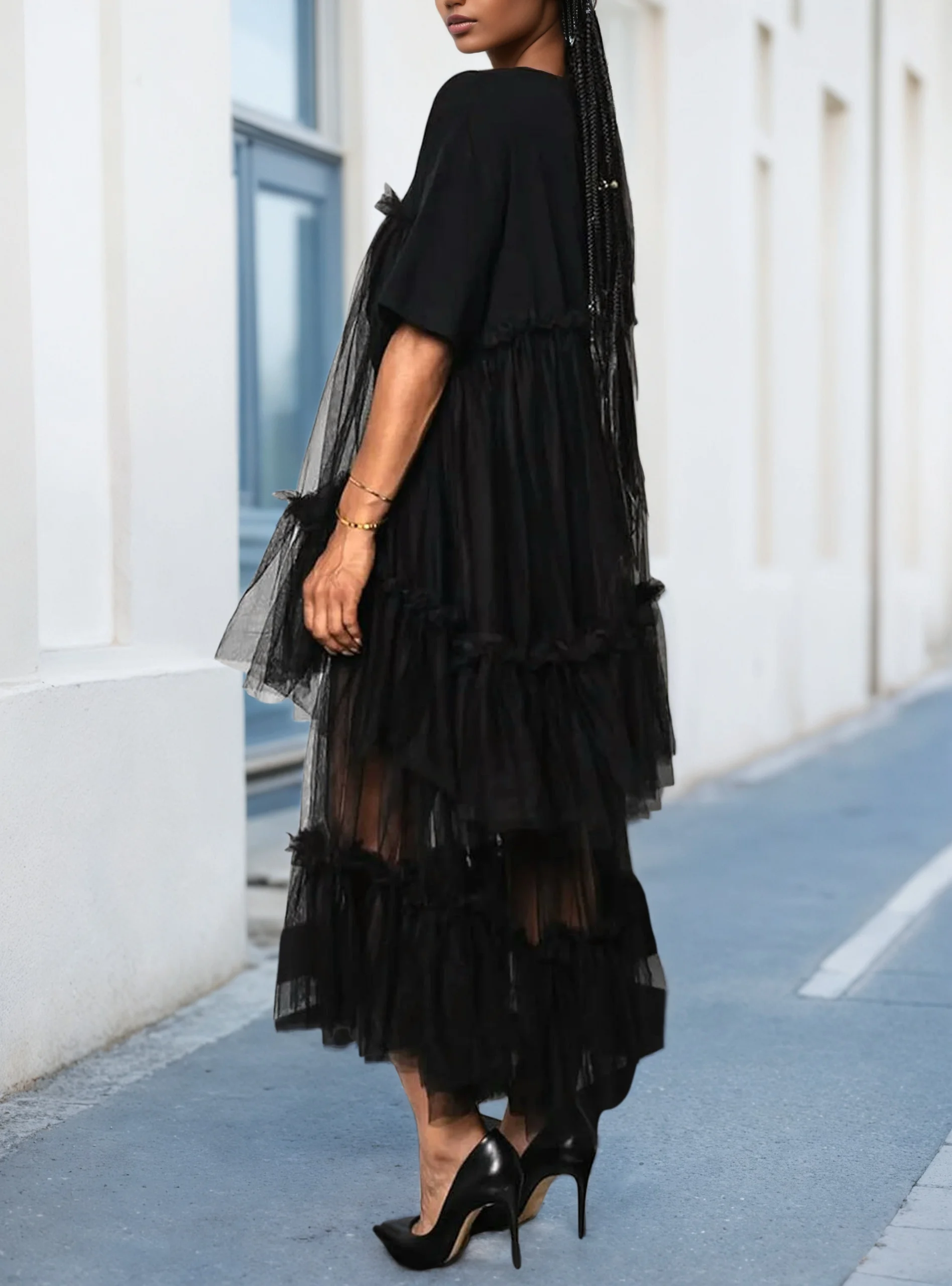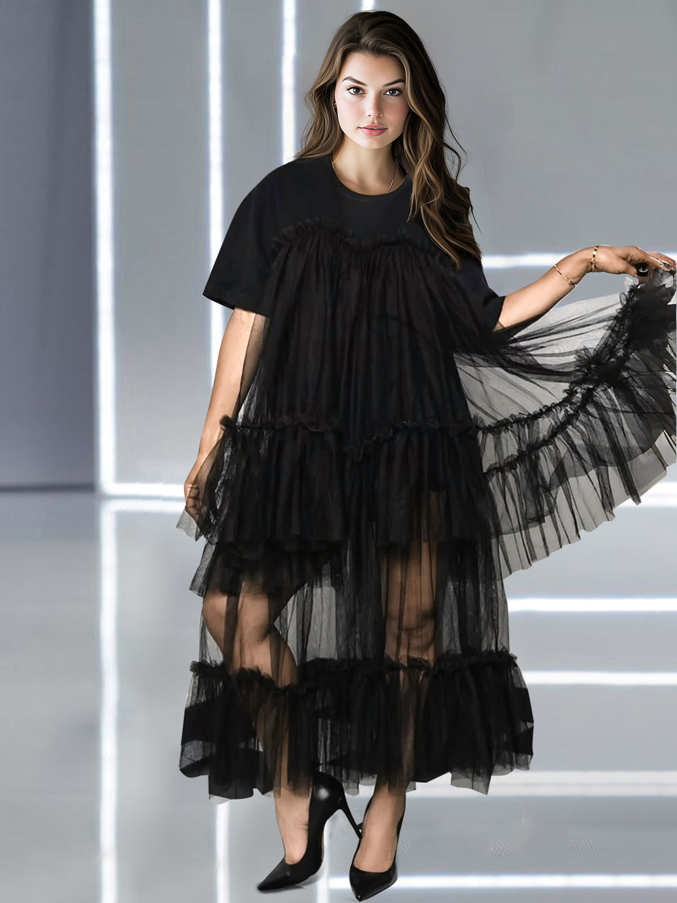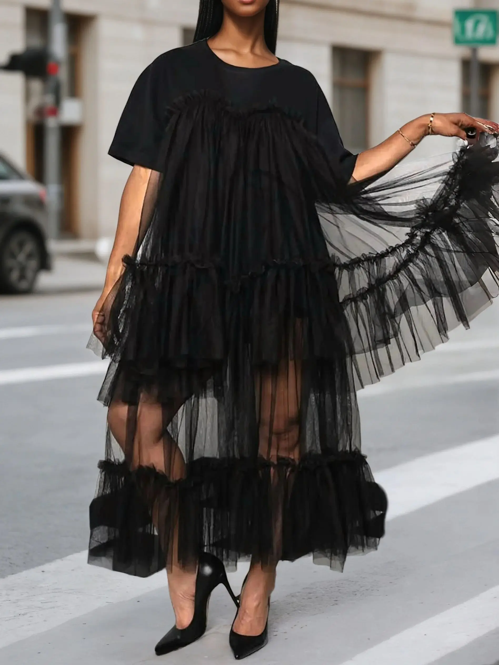 Women’s Ruffle Tulle Dresses Round Neck Short Sleeve Sheer See Through Pleated A-Line Y2K High Street Casual Summer Dresses 2025