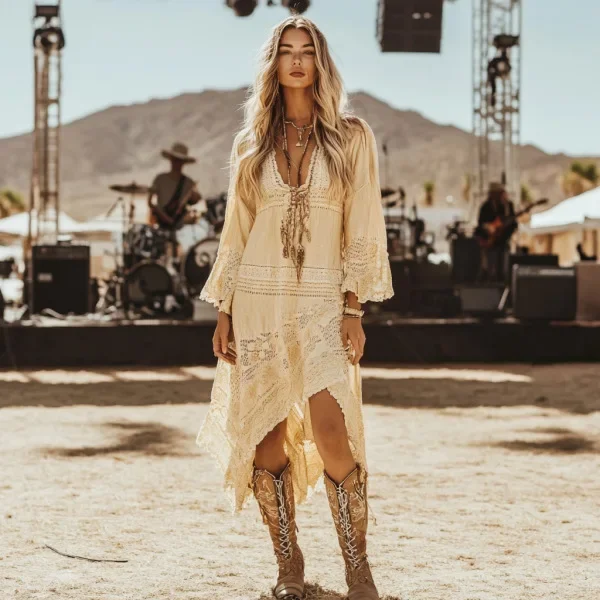 Women’s Sexy V-neck Hollow Out Dress Flare Sleeve Asymmetric Hem Boho Vintage Ethnic Style Flroal Elegant Long Dress Autumn