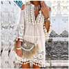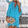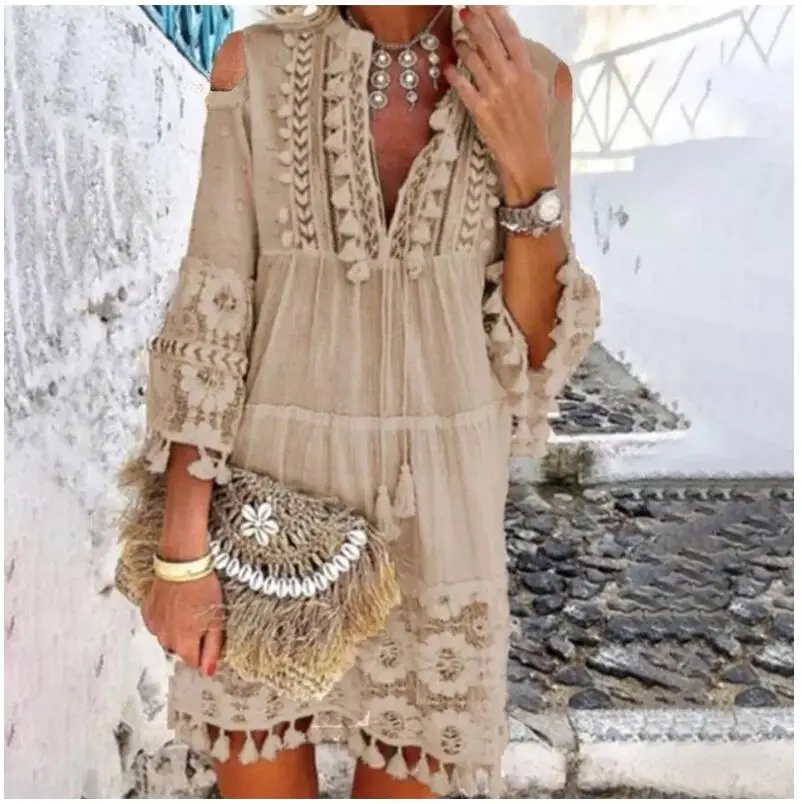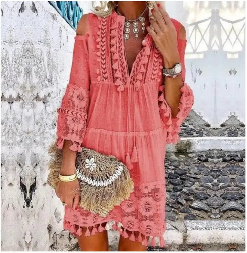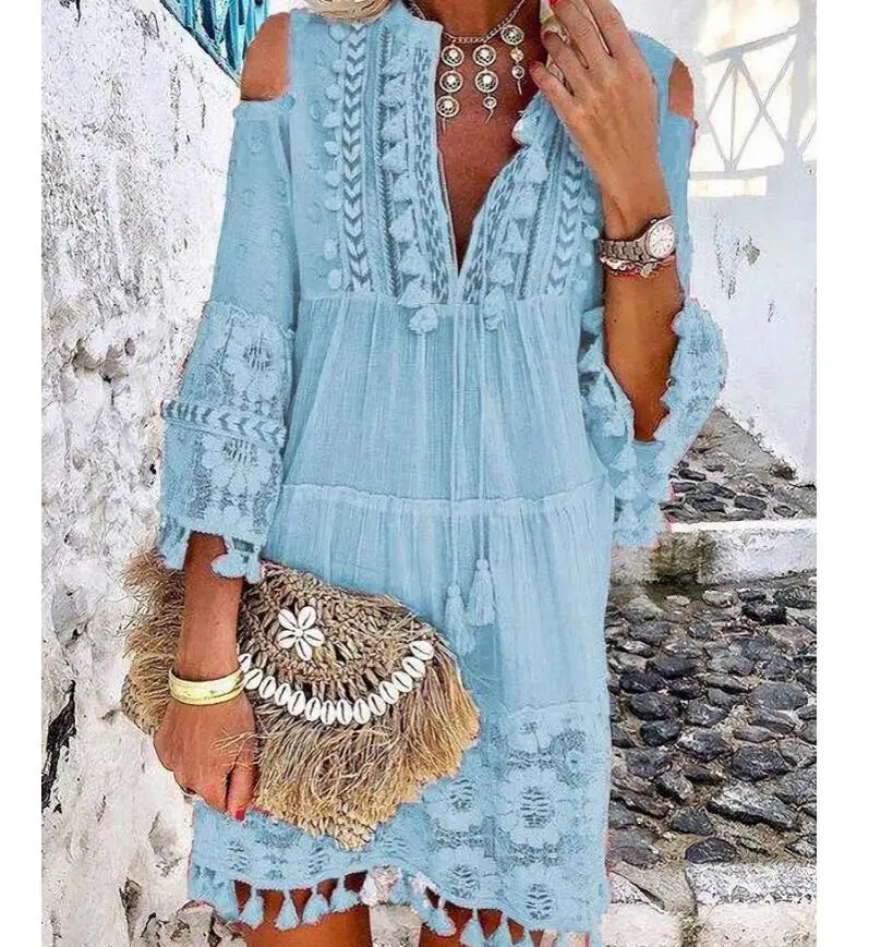 Women's Shift Dress Short 3/4 Length Sleeve Tassel Fringe Lace Cold Shoulder Summer Deep V Hot Casual Boho vacation dresses