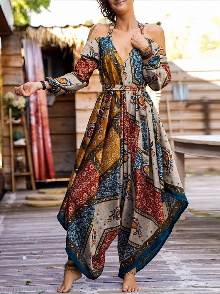 Women’s Sling Jumpsuit 2025 Vintage Ethnic Printing Jumpsuit Long Sleeve Harlan Long Pocket Wide Leg Pants Combination Plus Size