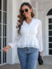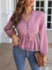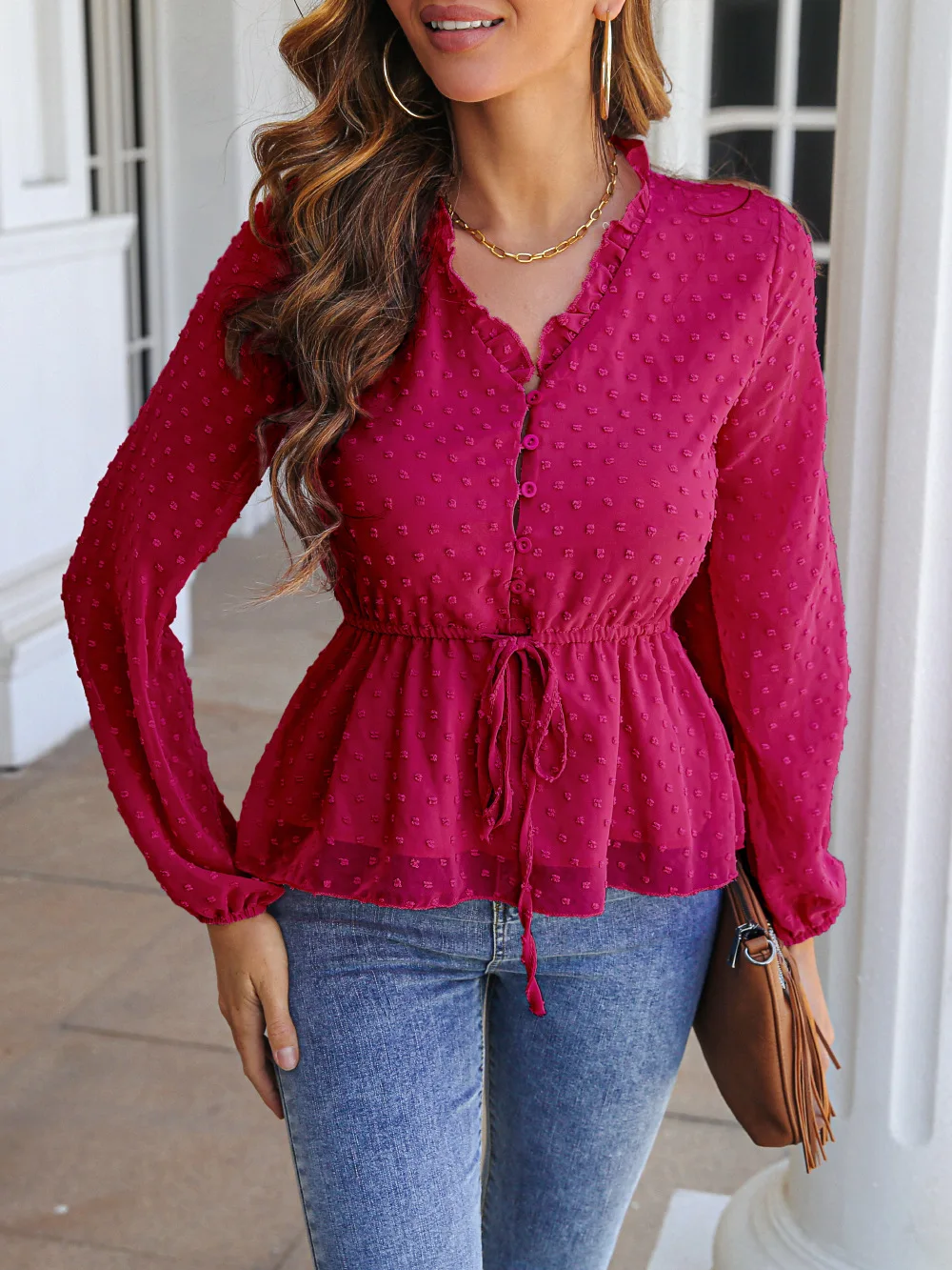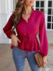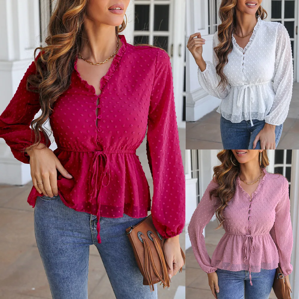 Women's Spring/Summer V Neck Polka Dot Jacquard Waist Tie Top Chiffon Shirt Office Lady Solid Color Lantern Sleeve Blouse Femme