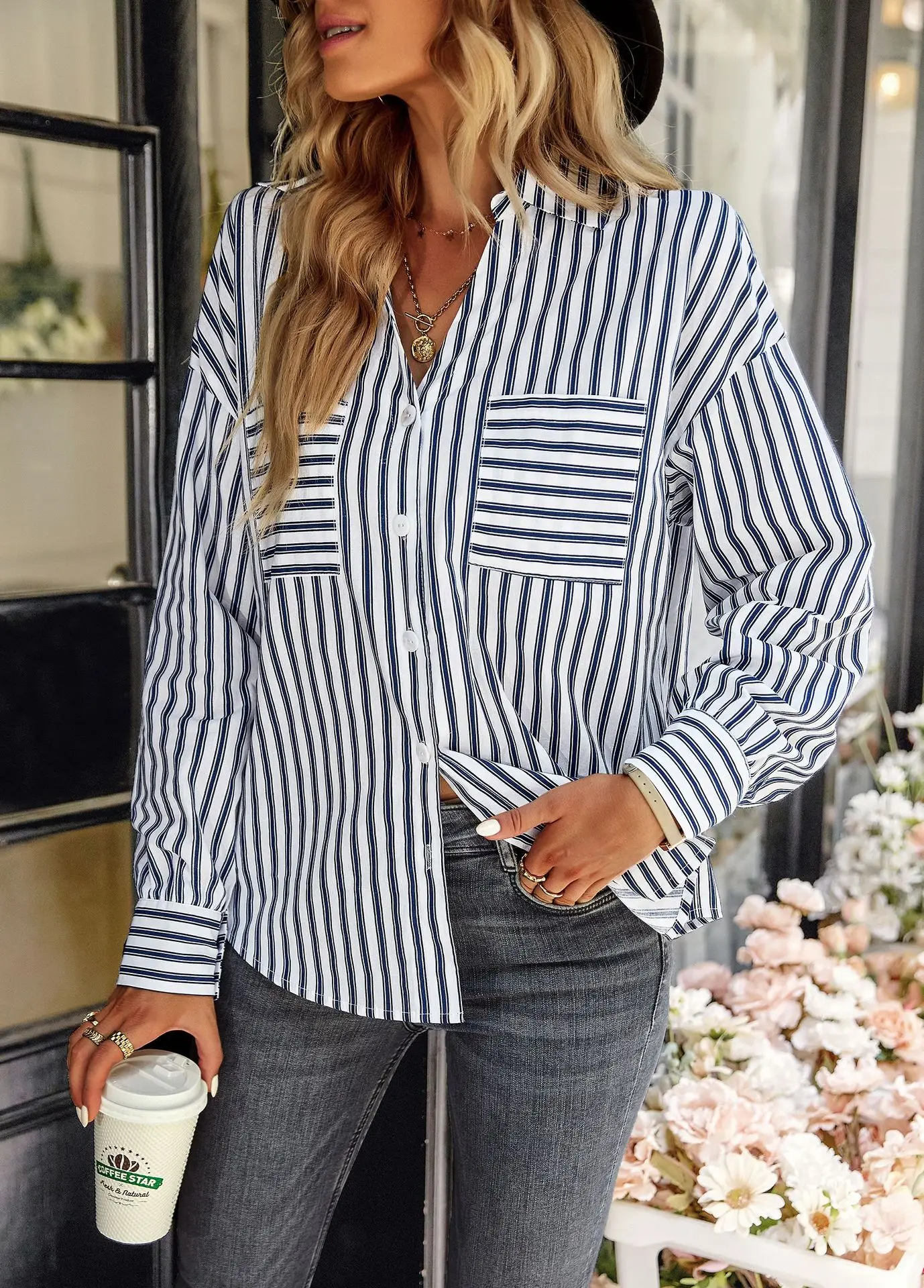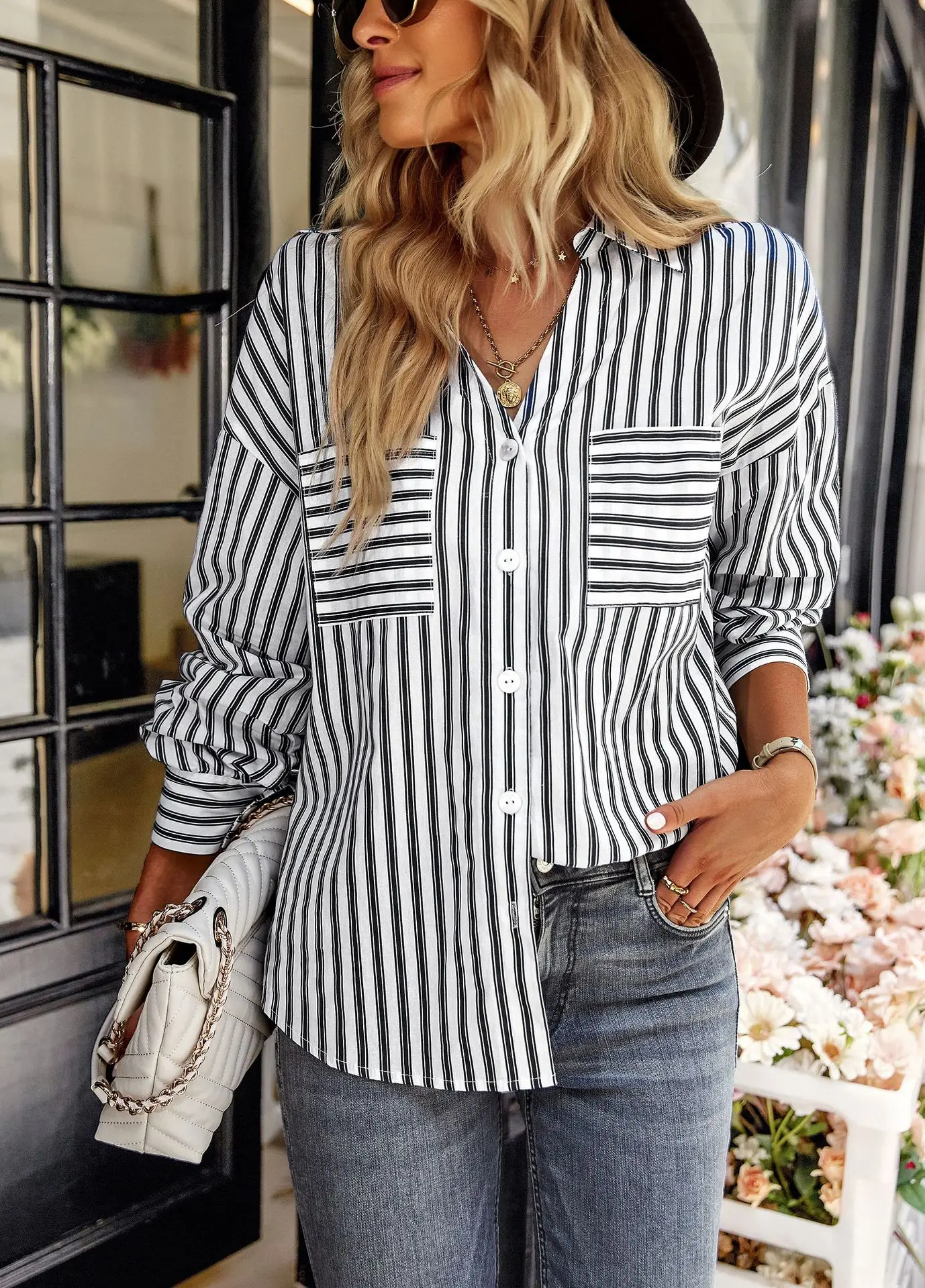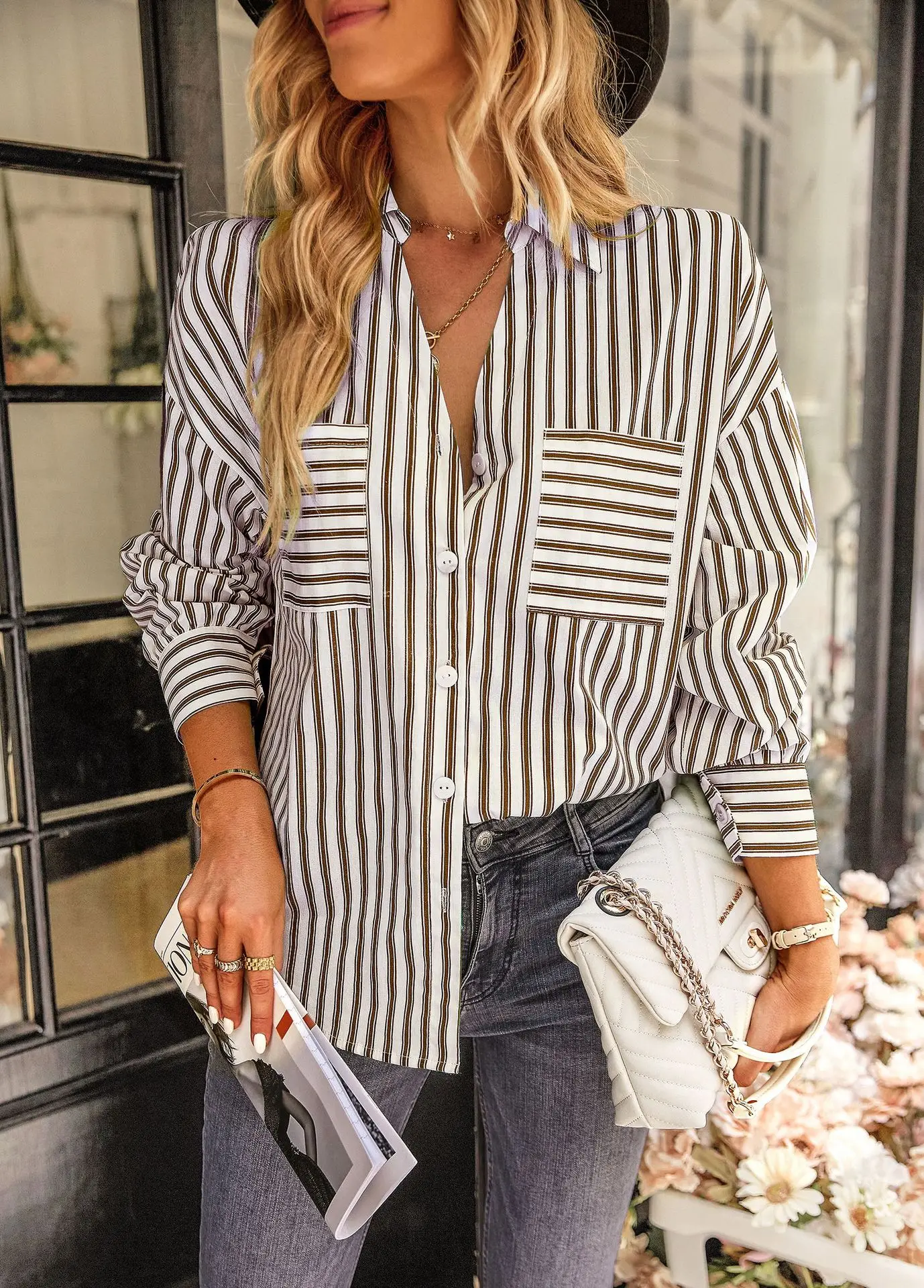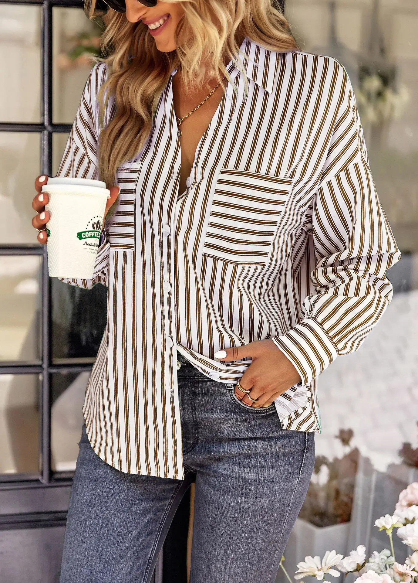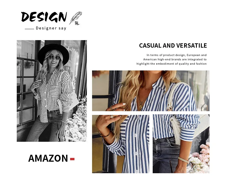 Women's Striped Shirt 2022 Spring And Autumn Office Lady V Neck Single-breasted Pocket Stitching Blouse Tops Blusas Y Camisas