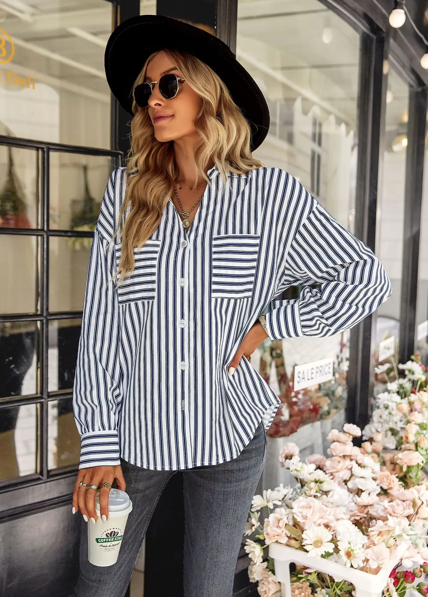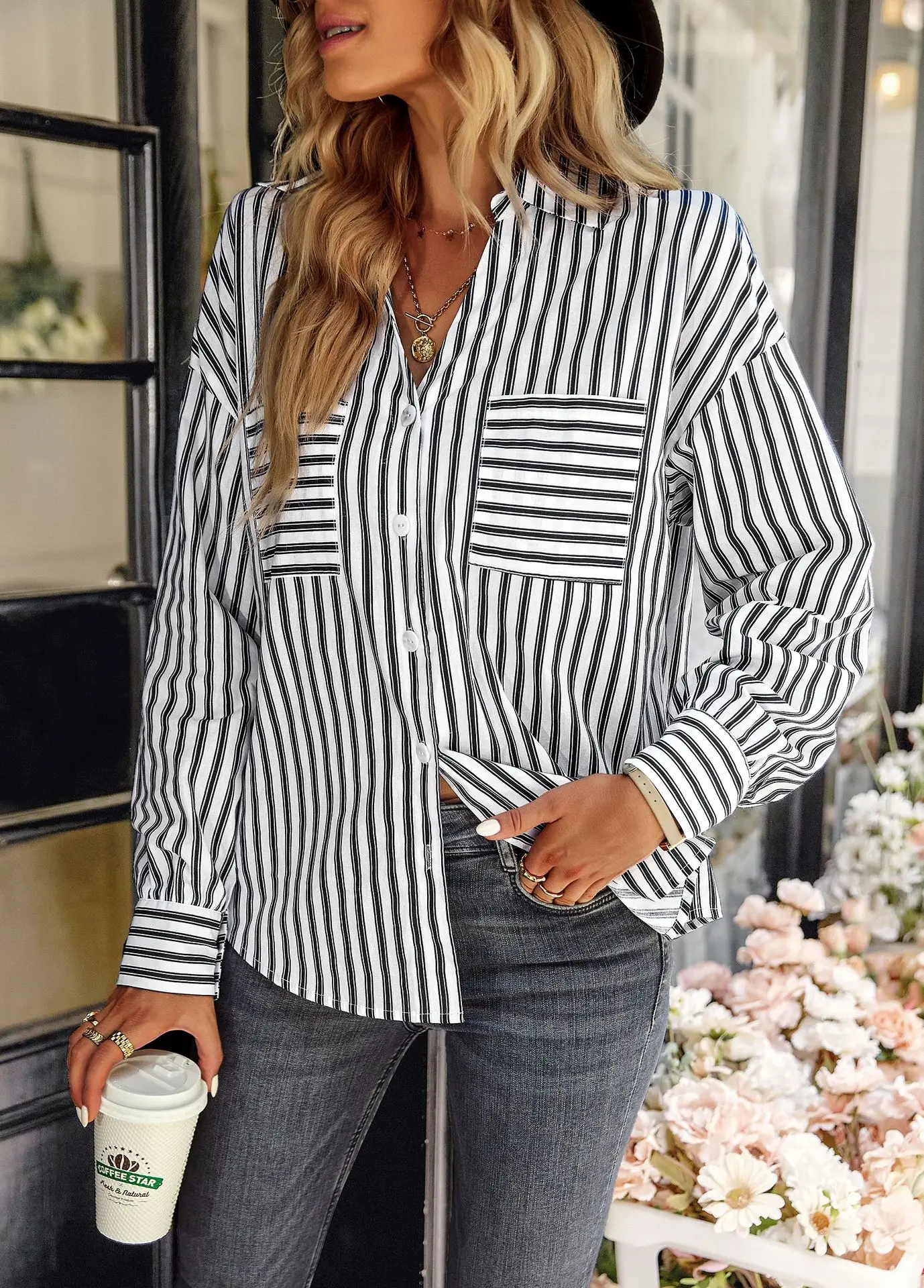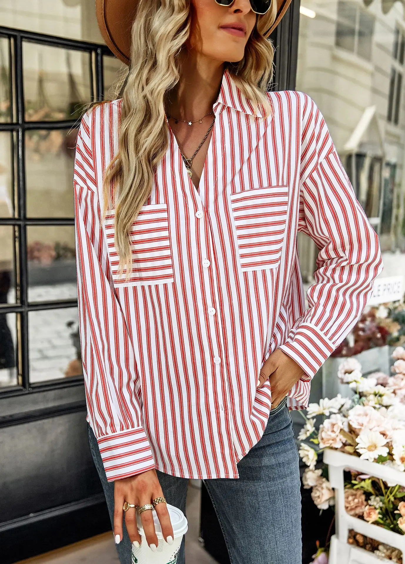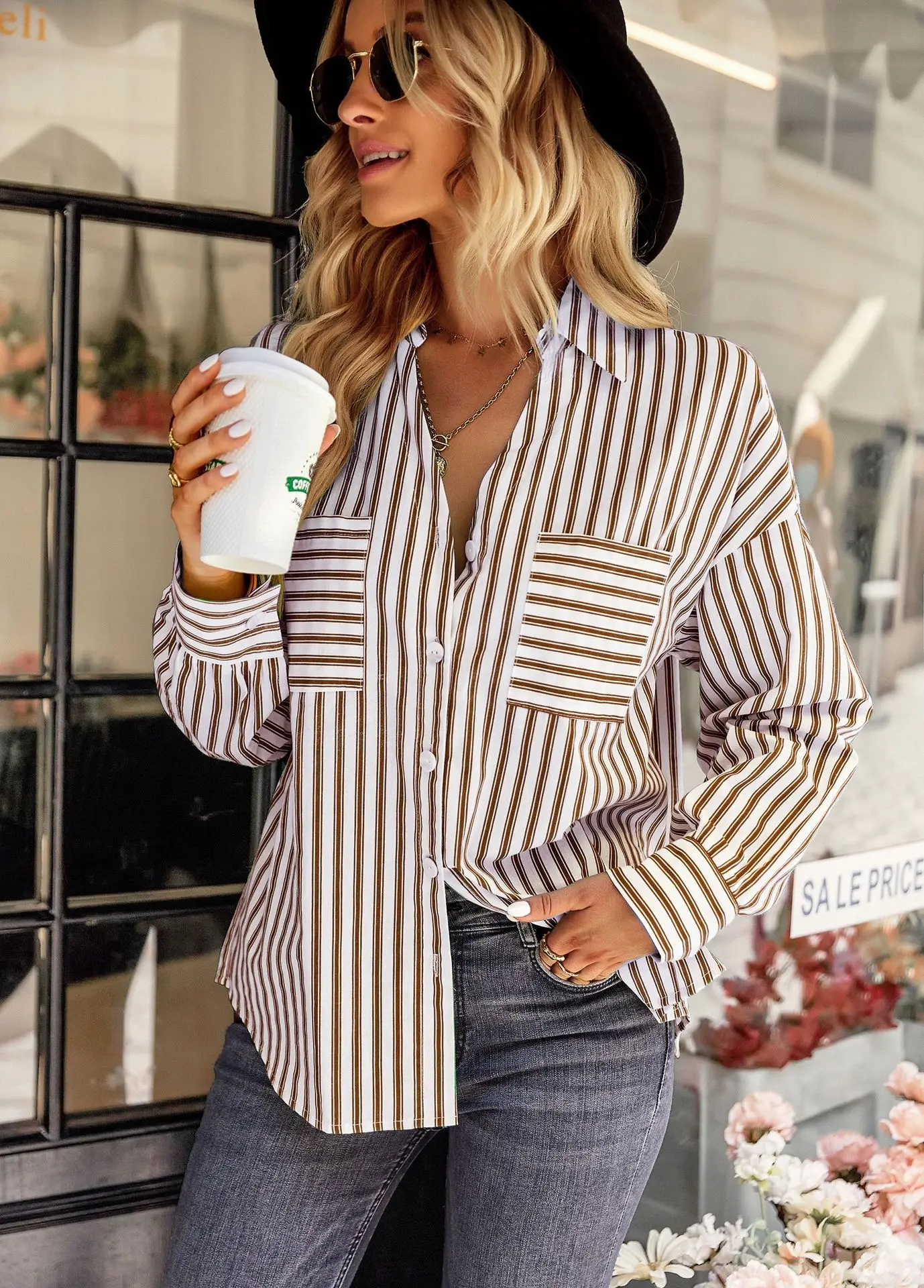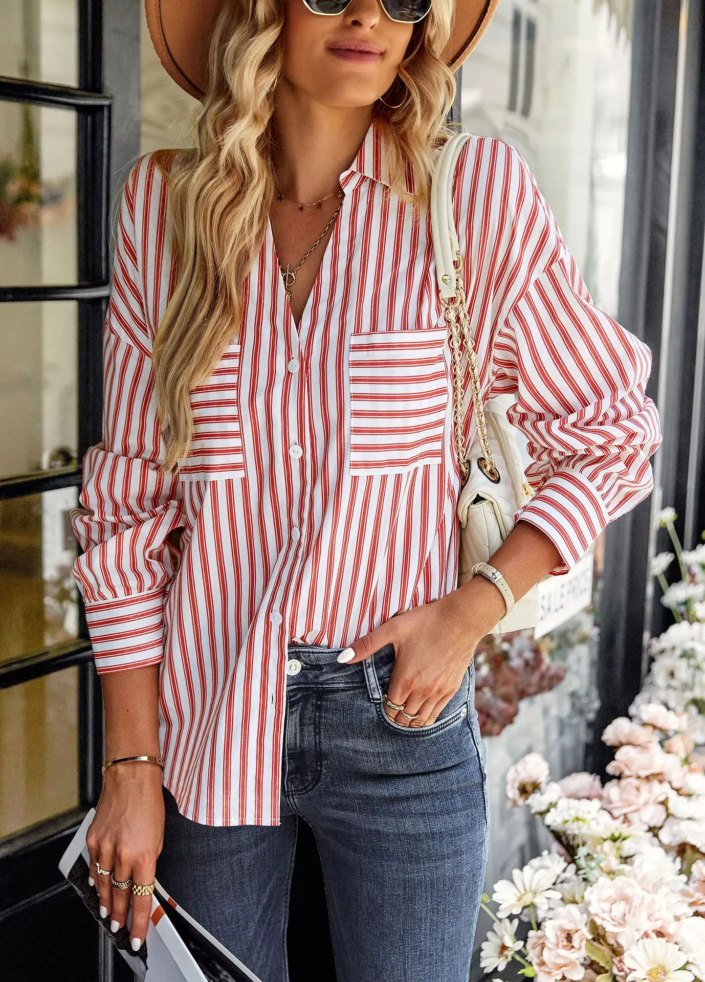 Women's Striped Shirt 2022 Spring And Autumn Office Lady V Neck Single-breasted Pocket Stitching Blouse Tops Blusas Y Camisas
