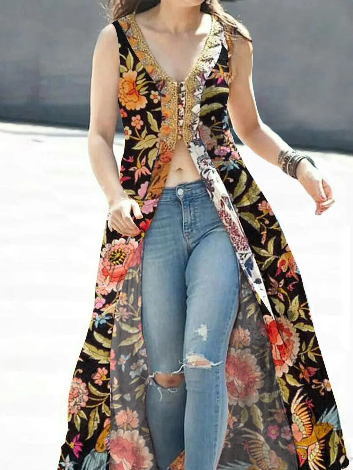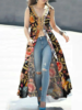 Women’s Tank Dress Floral Printing Split Sexy Indie Folk Vintage Sleeveless High Street Female Retro V-Neck Long Dress 2025