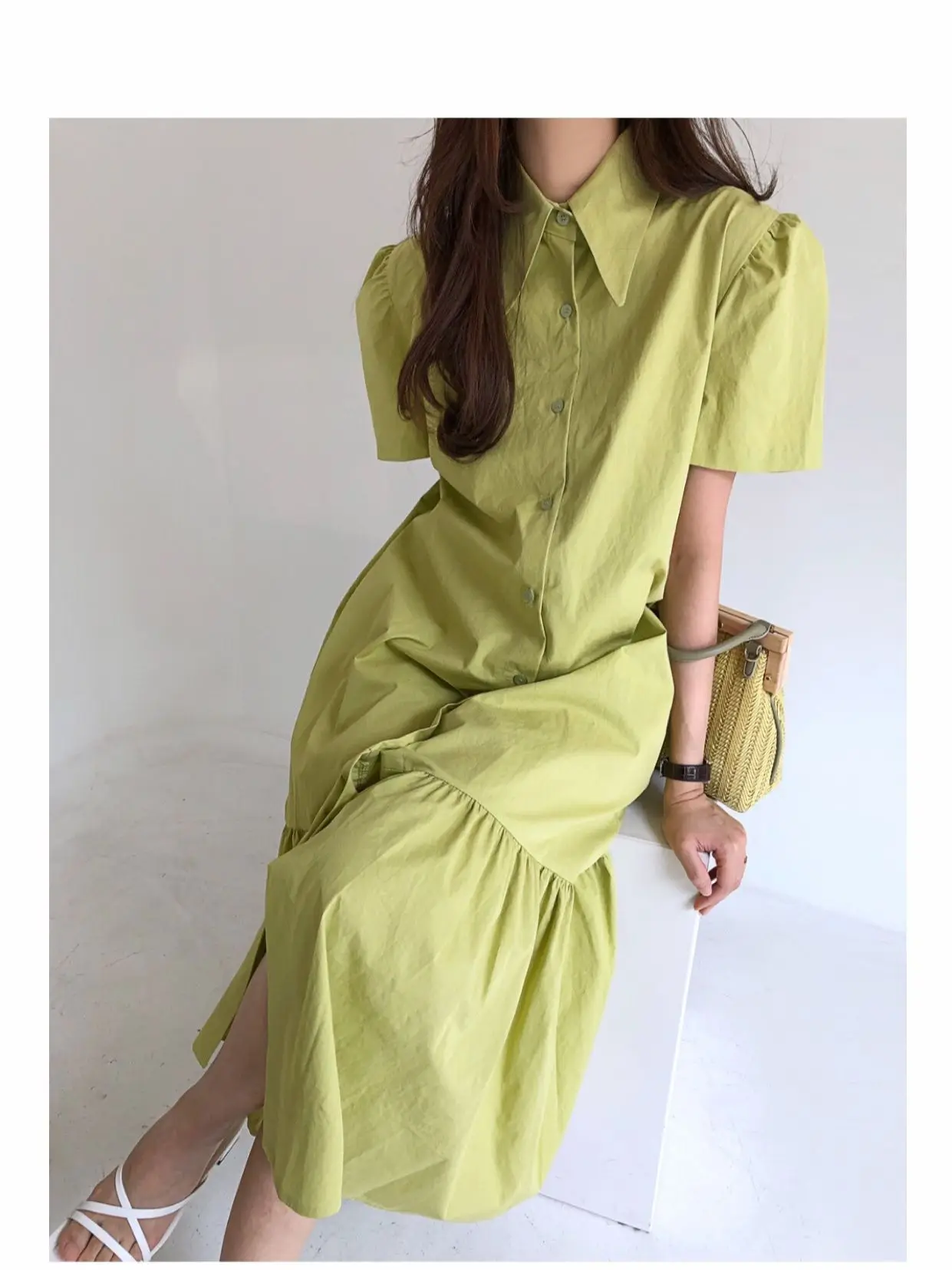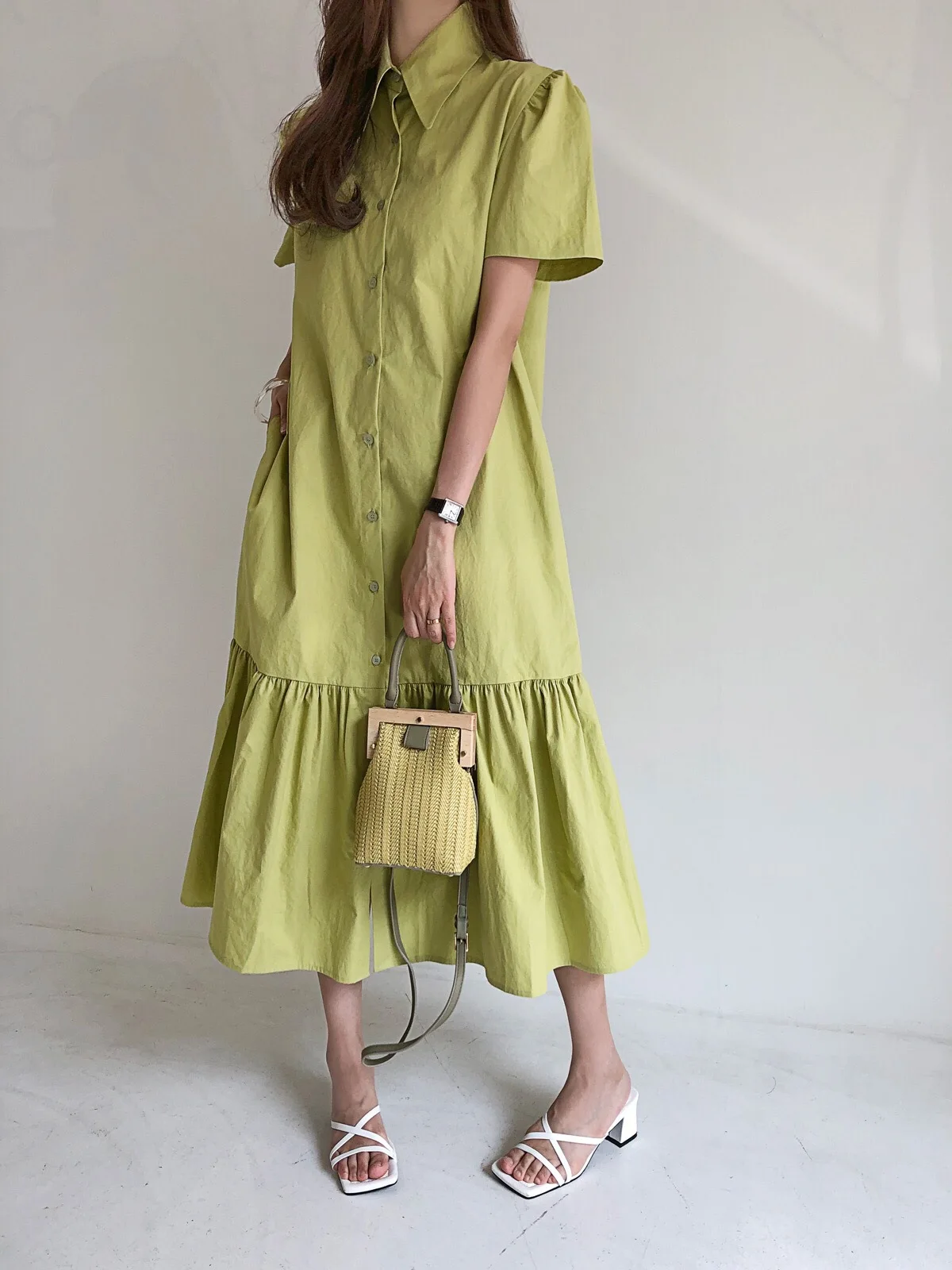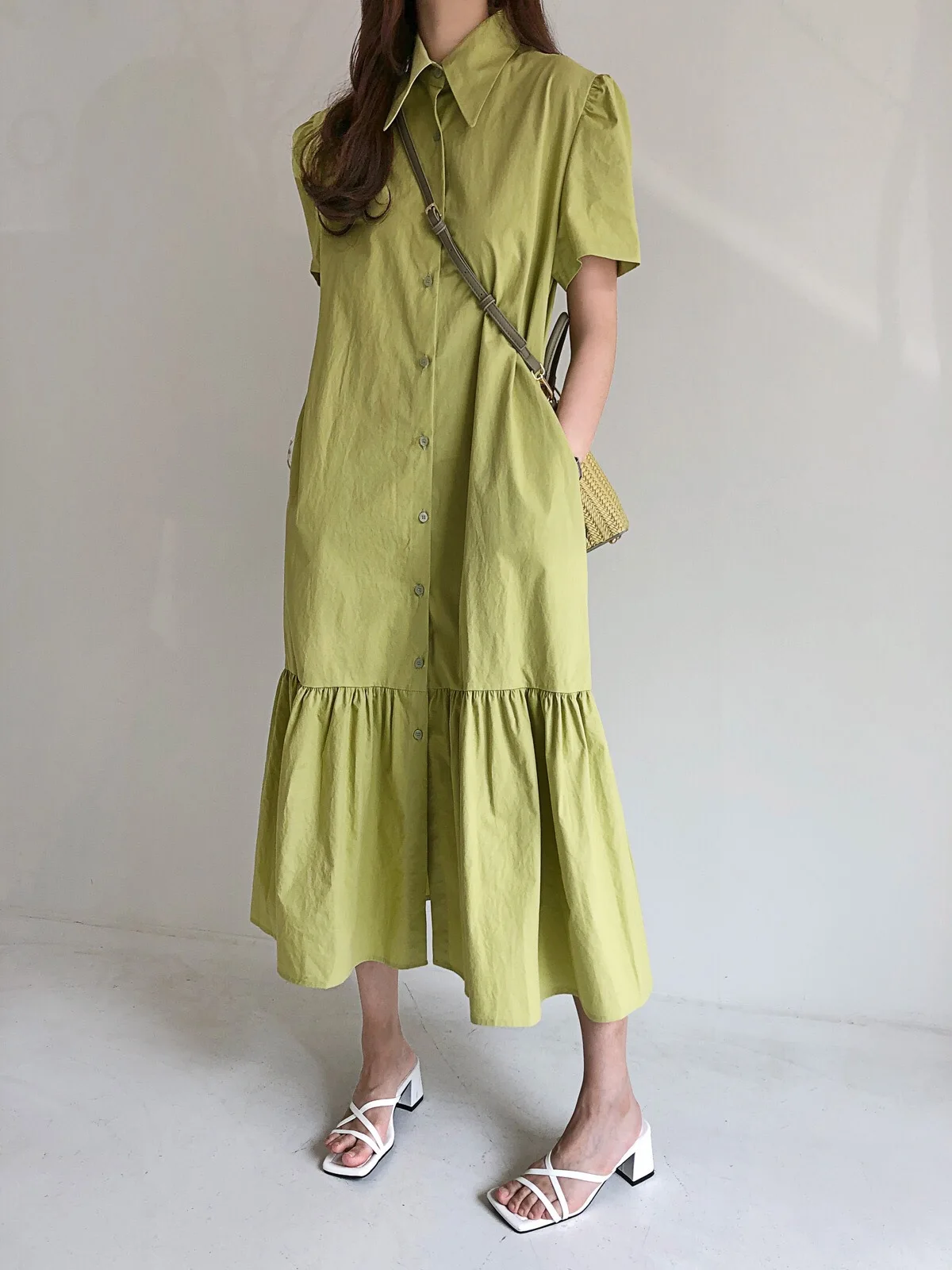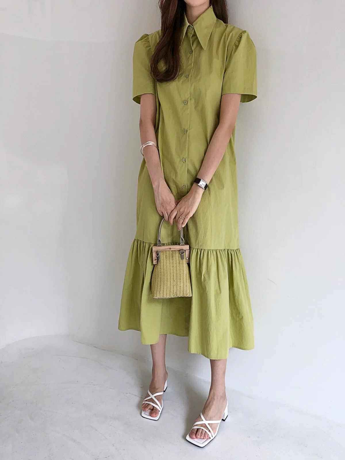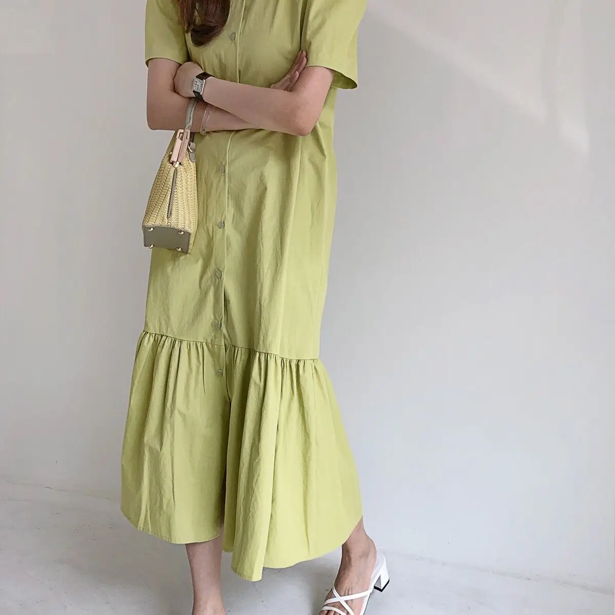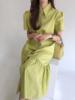 Women'S V-Neck Short-Sleeved Button-Shaped Belt Pocket Army Green Cotton And Linen Casual Long Skirt