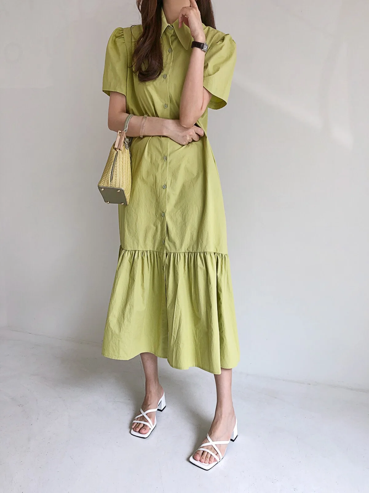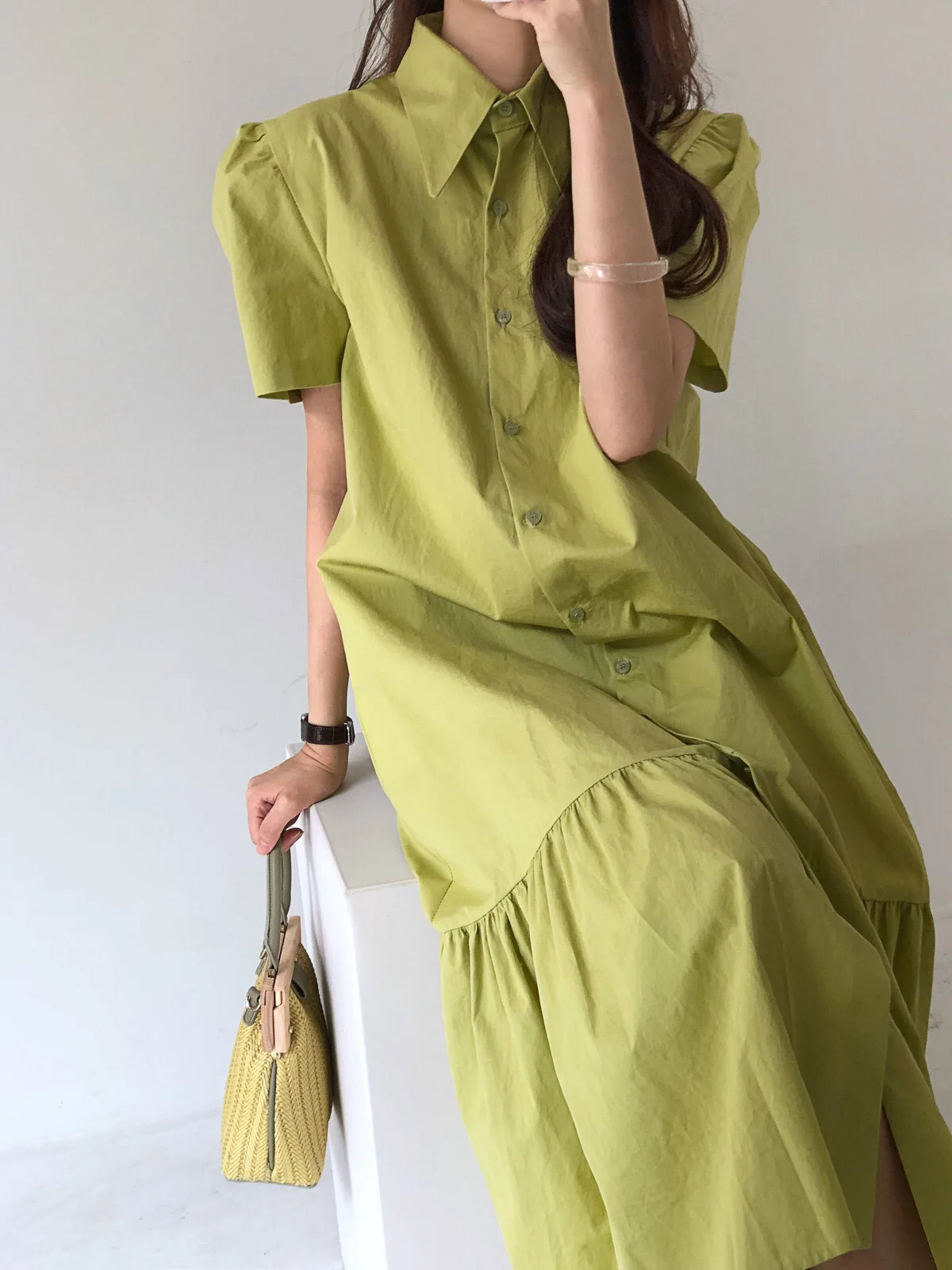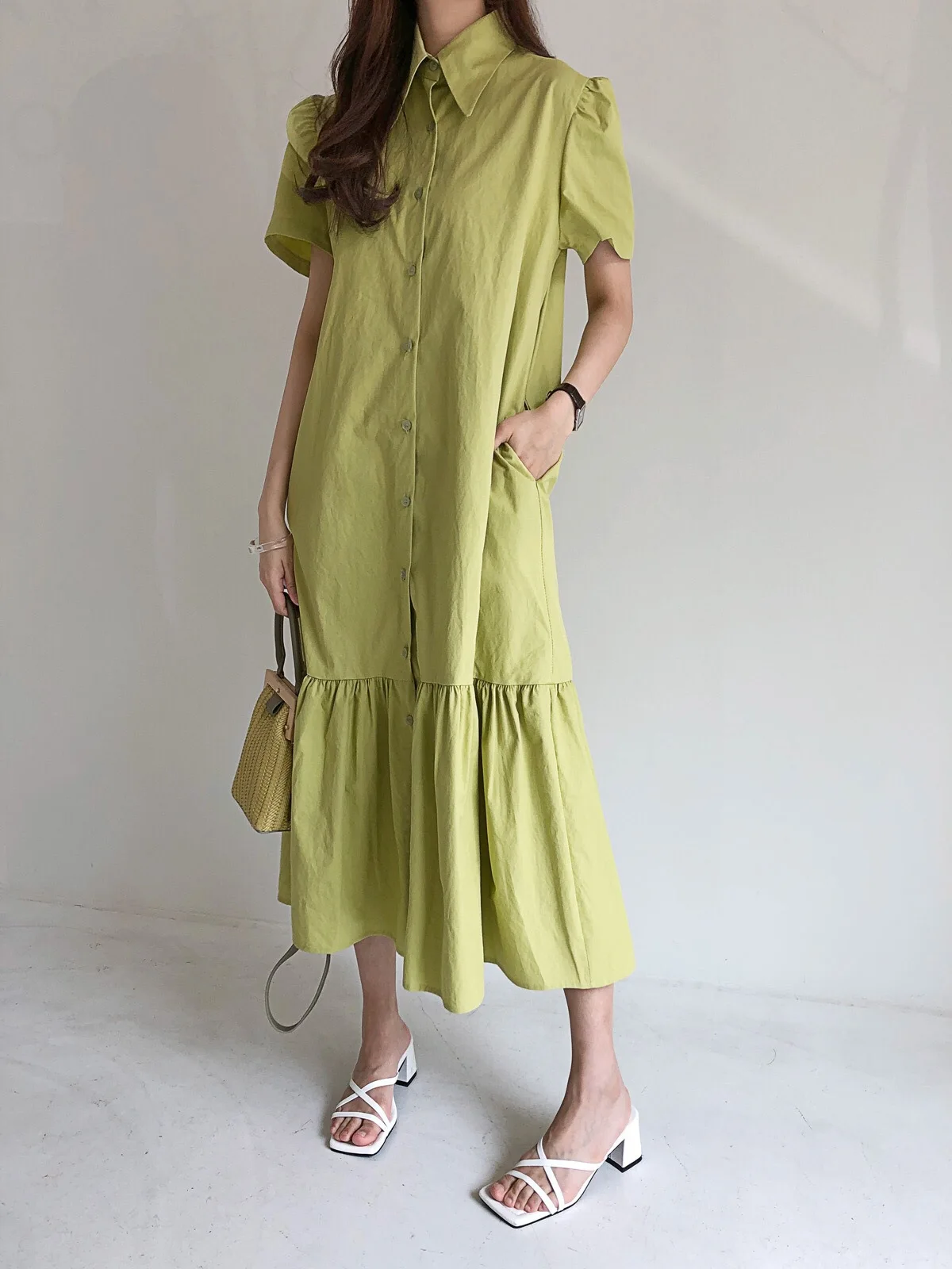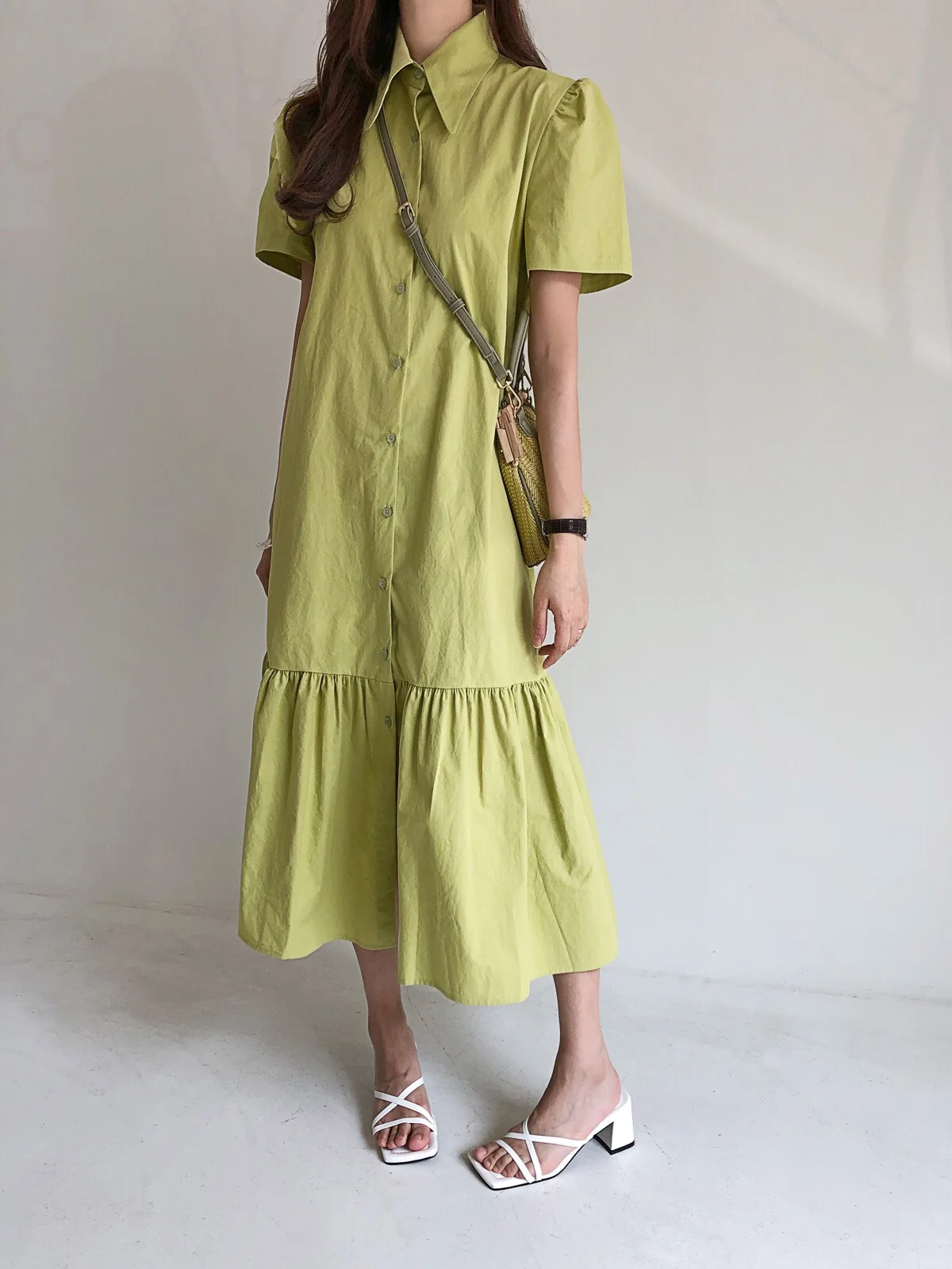 Women'S V-Neck Short-Sleeved Button-Shaped Belt Pocket Army Green Cotton And Linen Casual Long Skirt