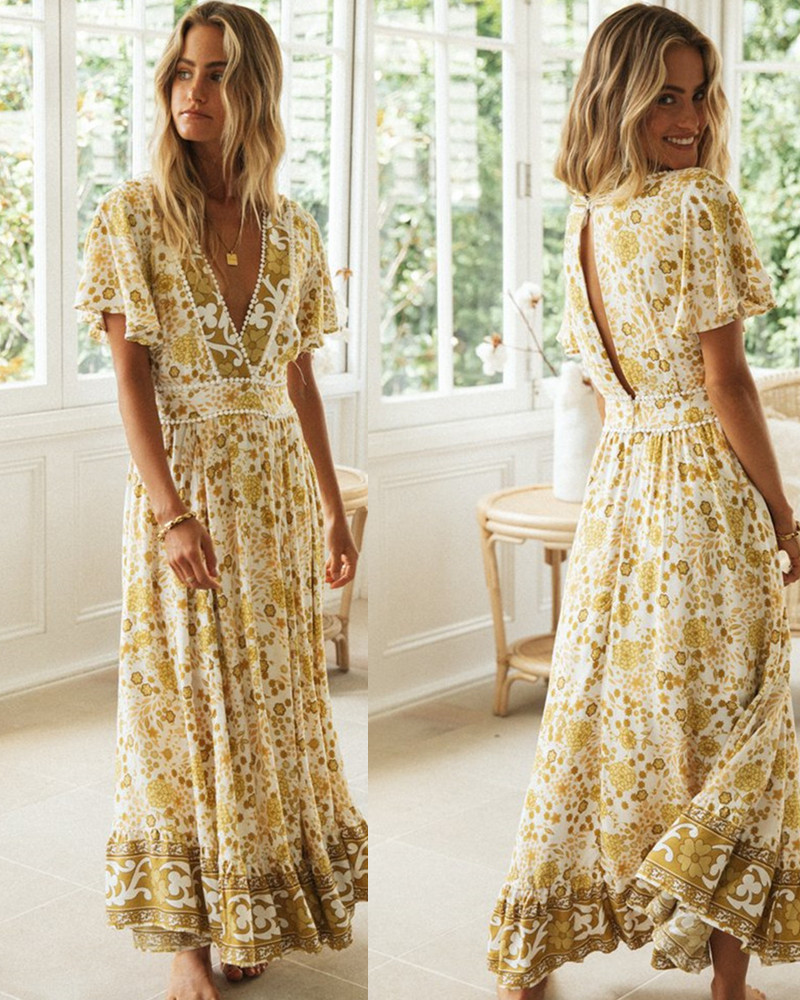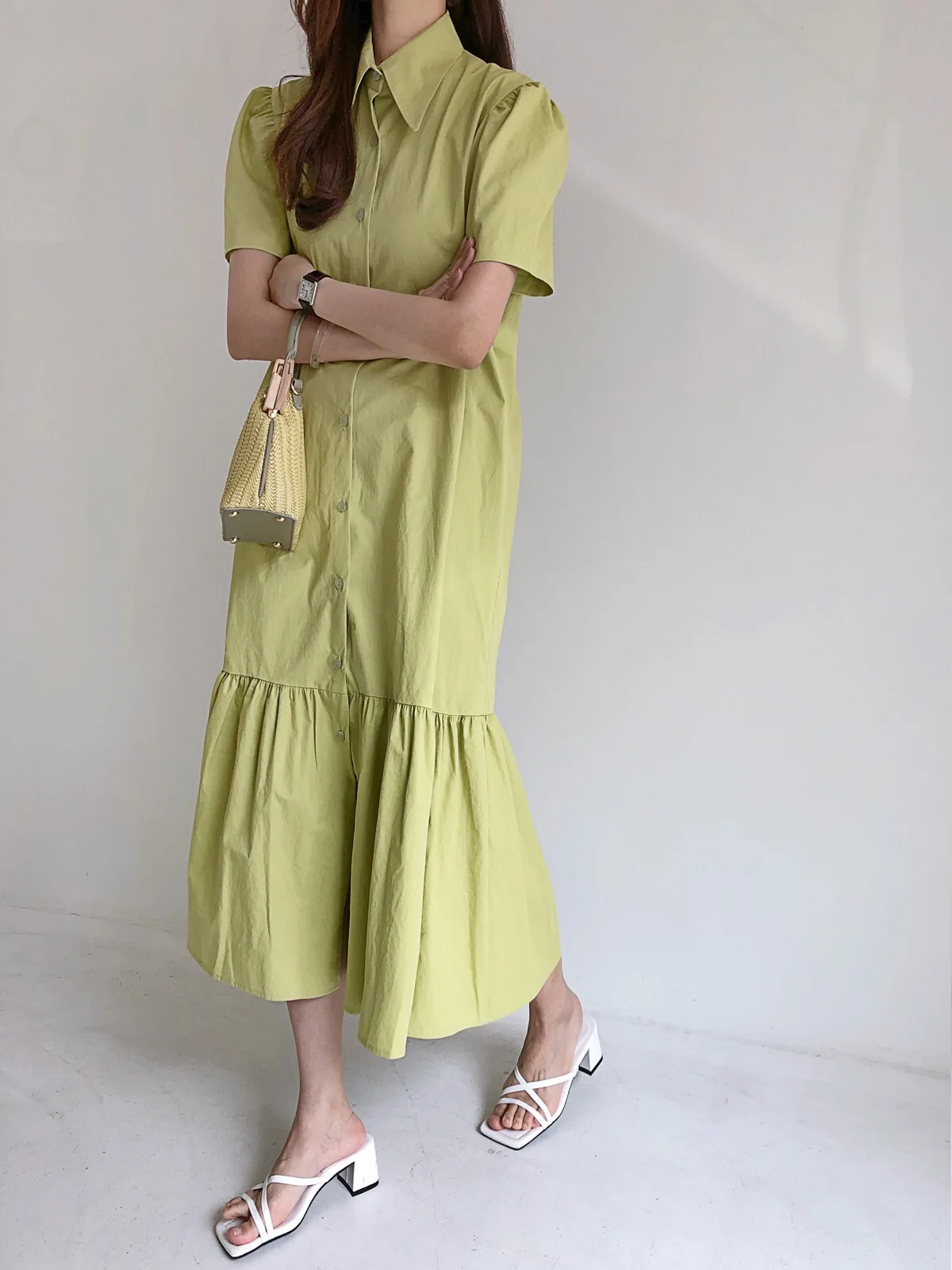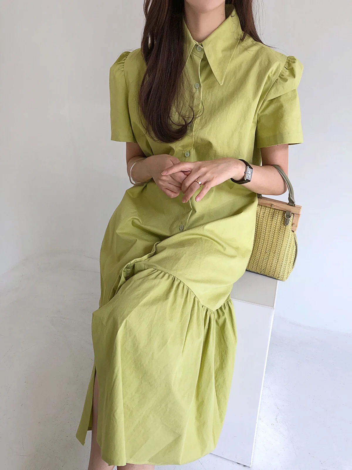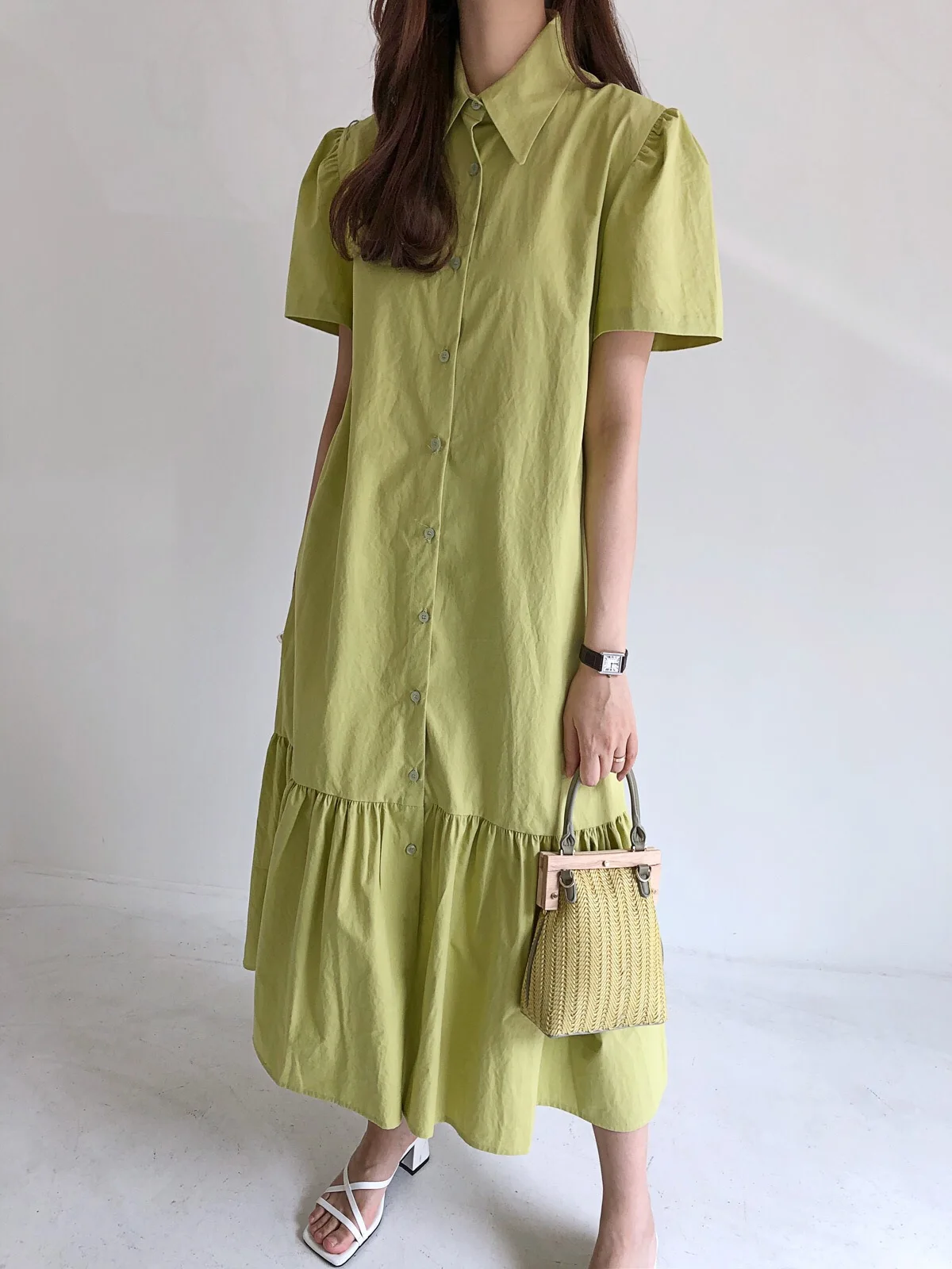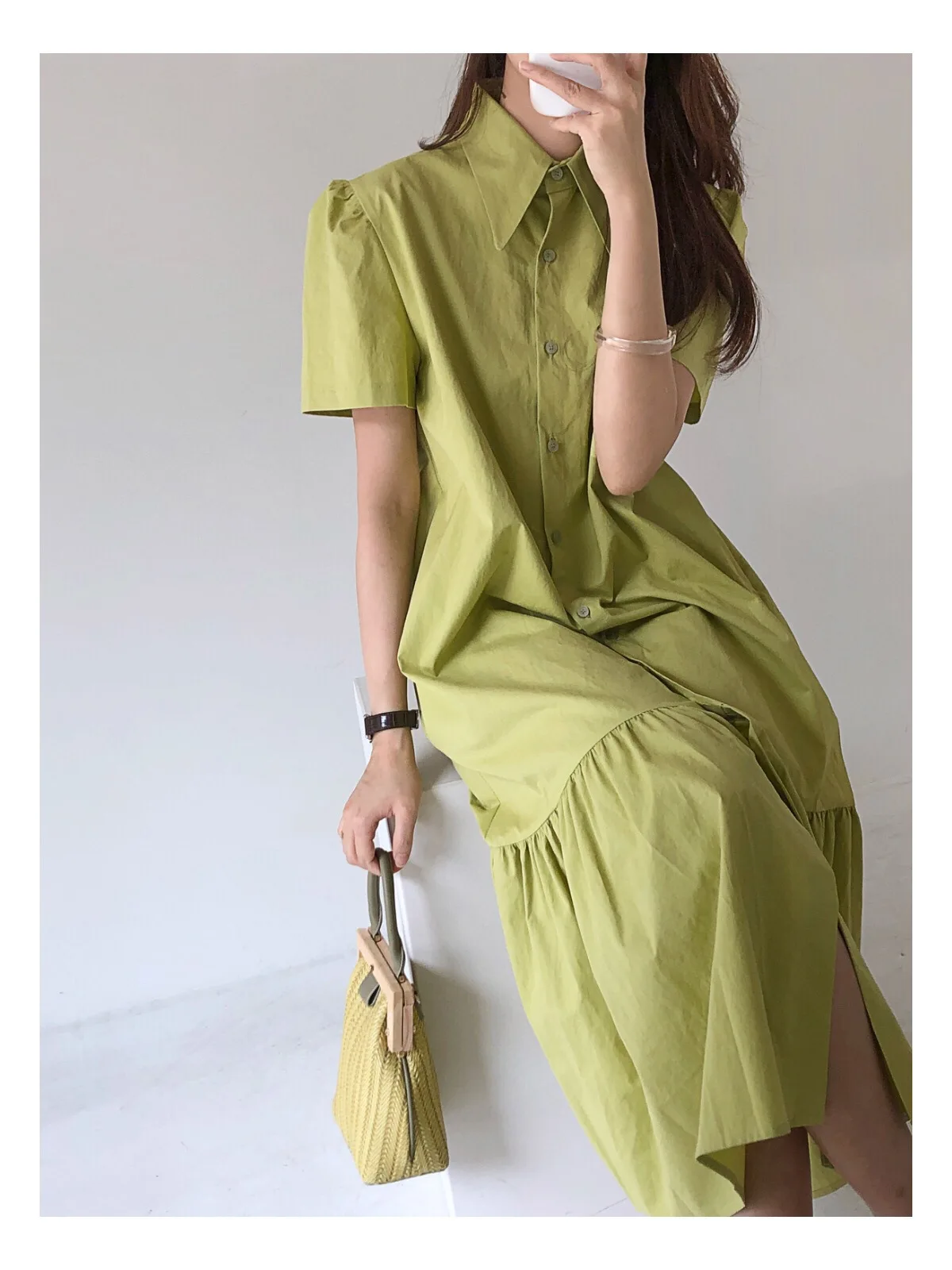 Women'S V-Neck Short-Sleeved Button-Shaped Belt Pocket Army Green Cotton And Linen Casual Long Skirt