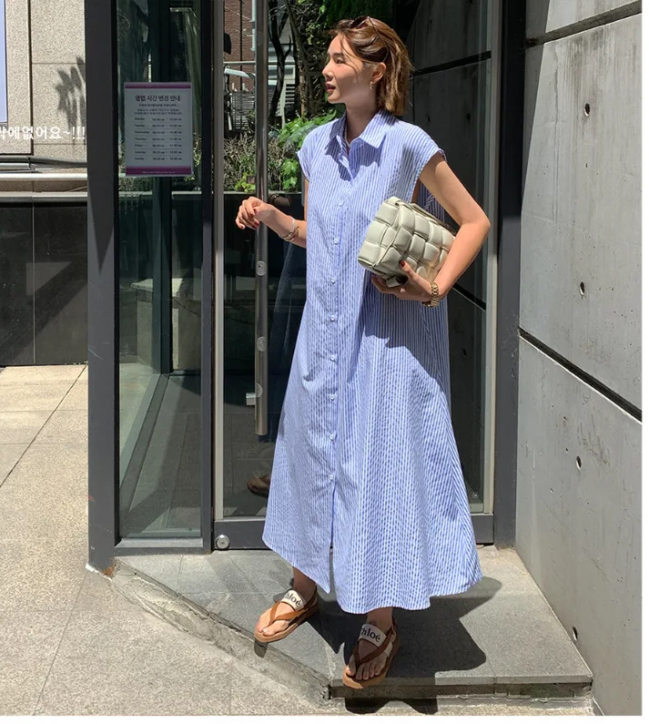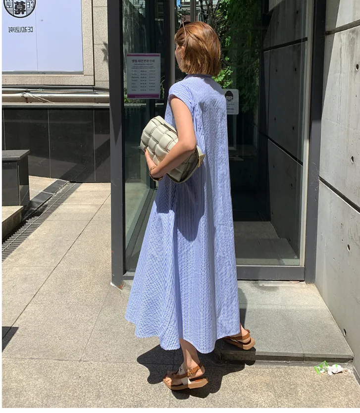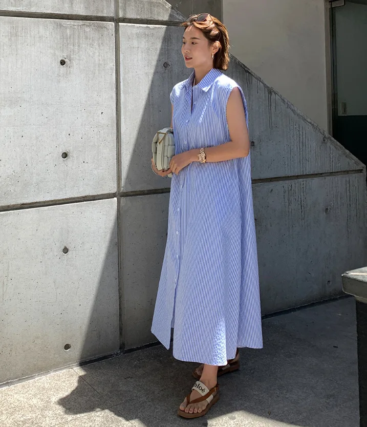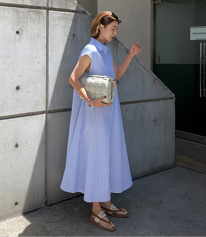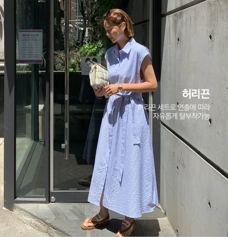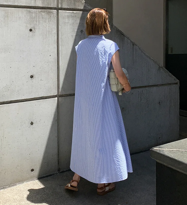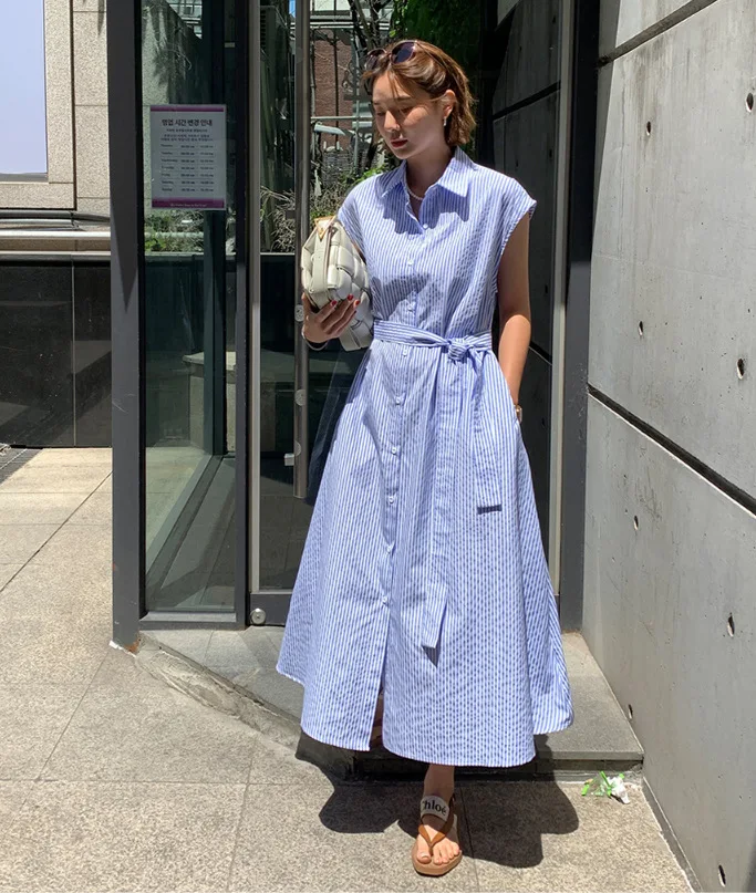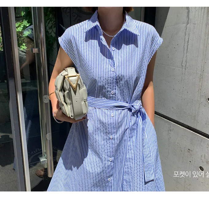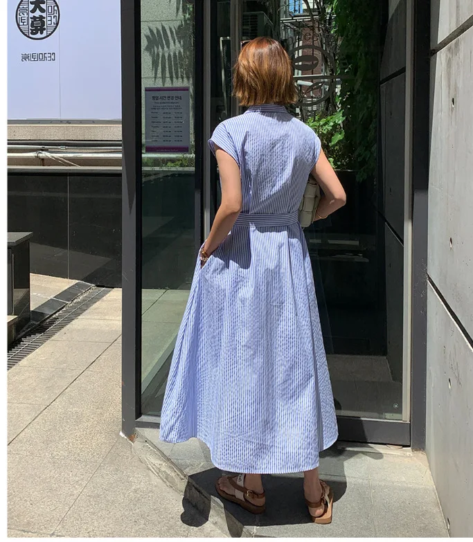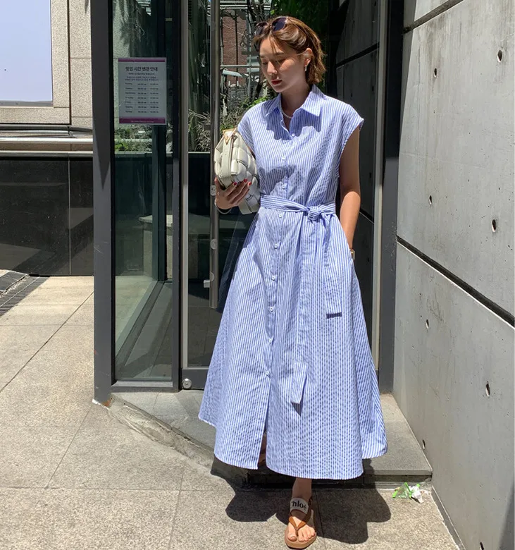 Women'S V-Necktie Button Belt Belt Sleeveless Striped Cotton Linen Casual Long Skirt