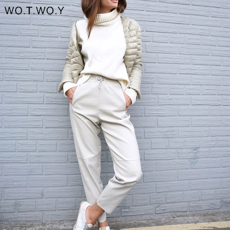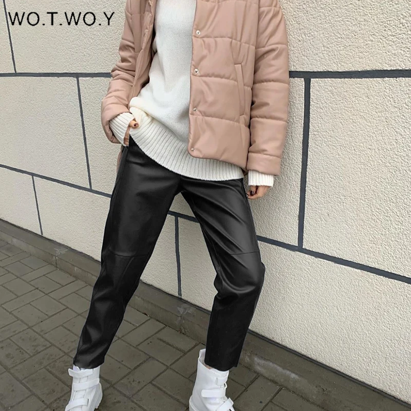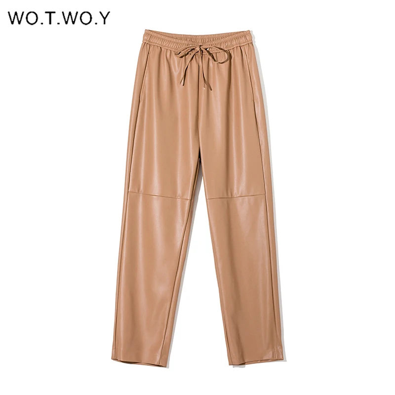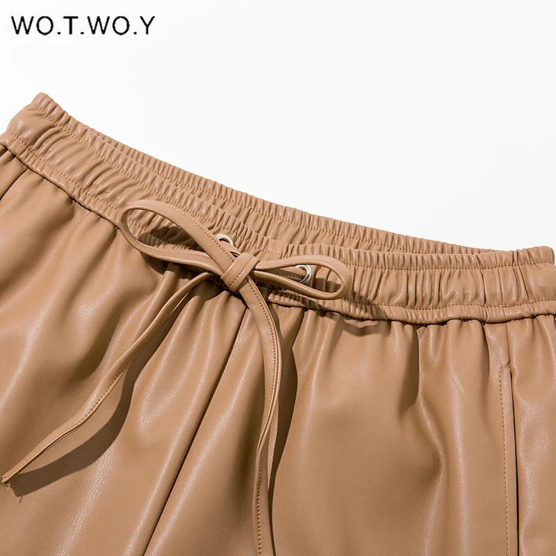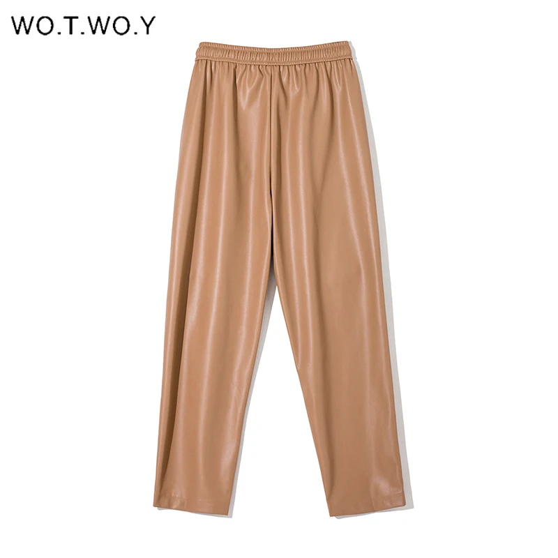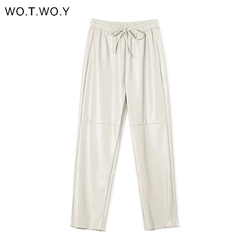 WOTWOY High Waist Spliced Loose Leather Pants Women Autumn Solid Drawstring PU Leather Trousers Women Straight Pants Female 2022