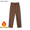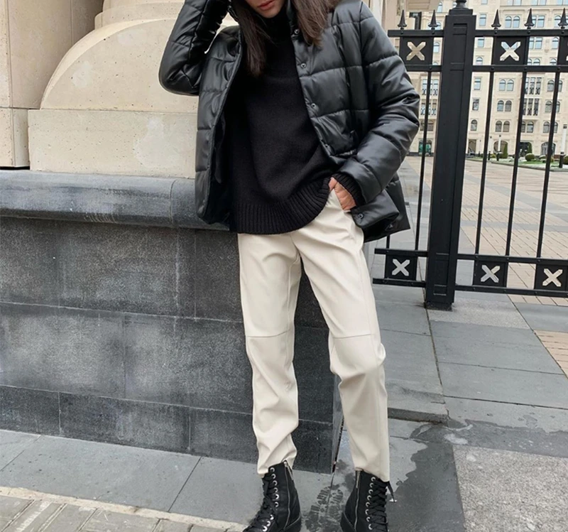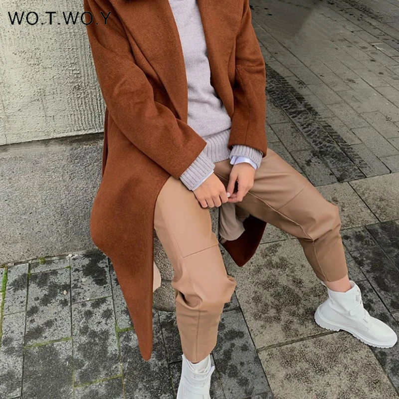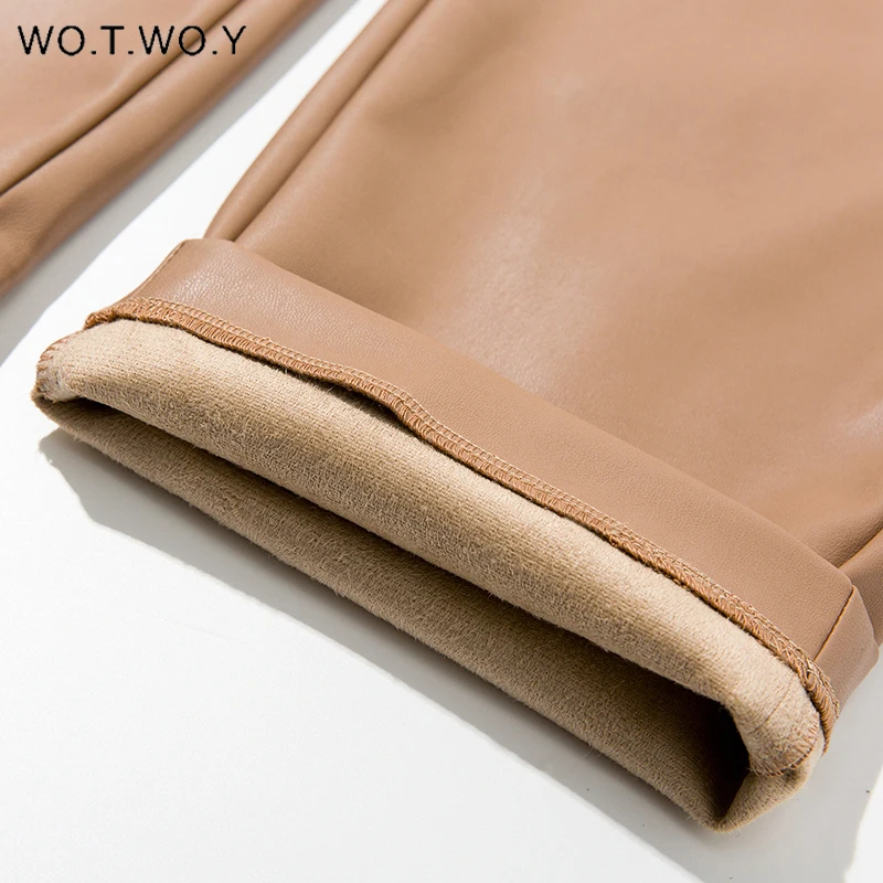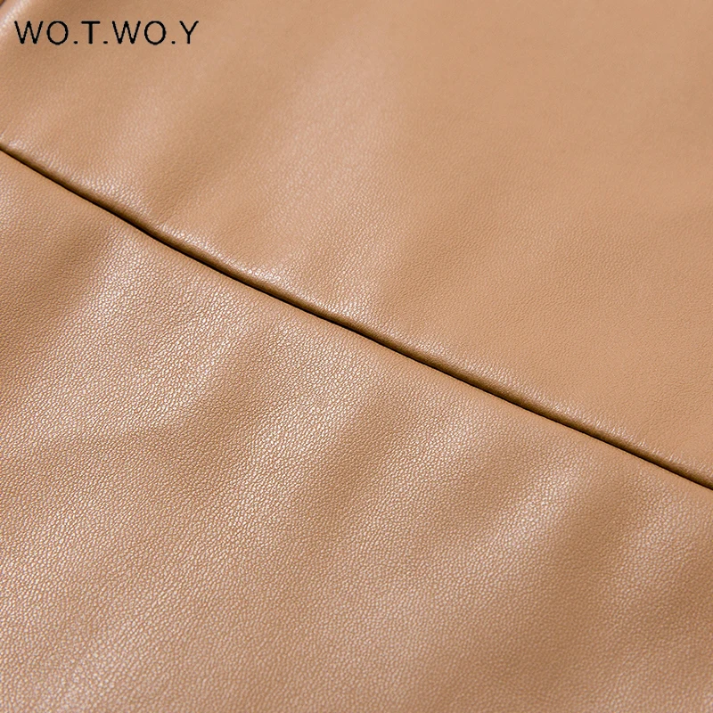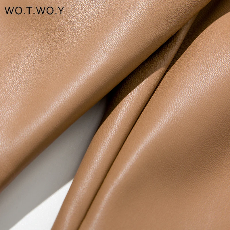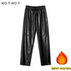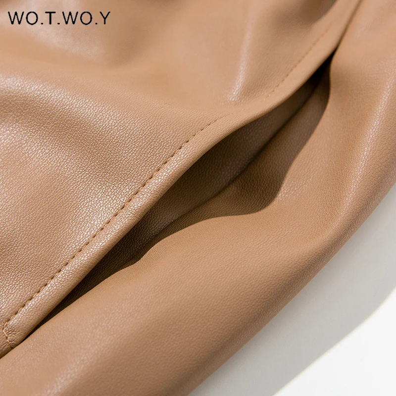 WOTWOY High Waist Spliced Loose Leather Pants Women Autumn Solid Drawstring PU Leather Trousers Women Straight Pants Female 2022