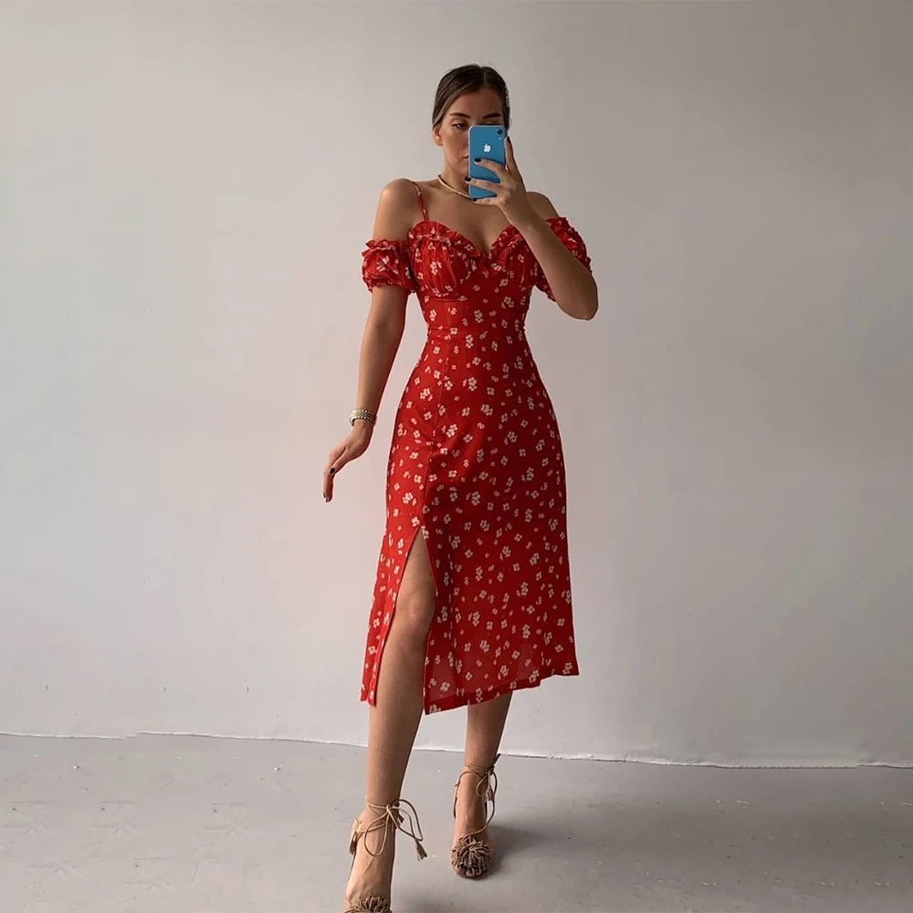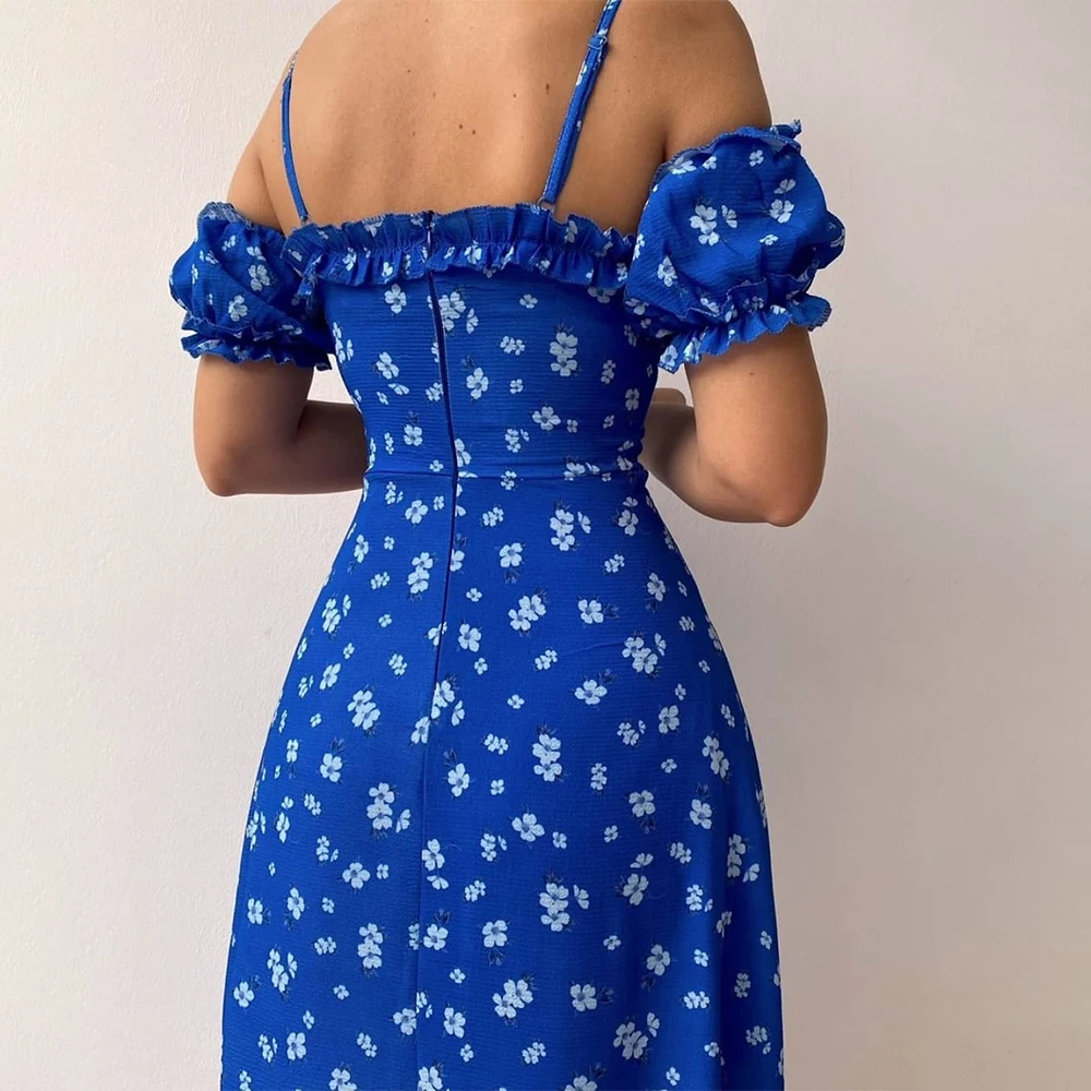 wsevypo Women’s Off Shoulder Frilly Suspender Dress Party Summer Ladies Short Sleeve V-neck Split Mid-length Dress Floarl A-Line