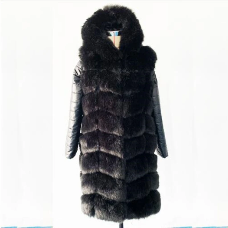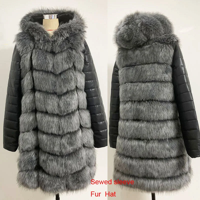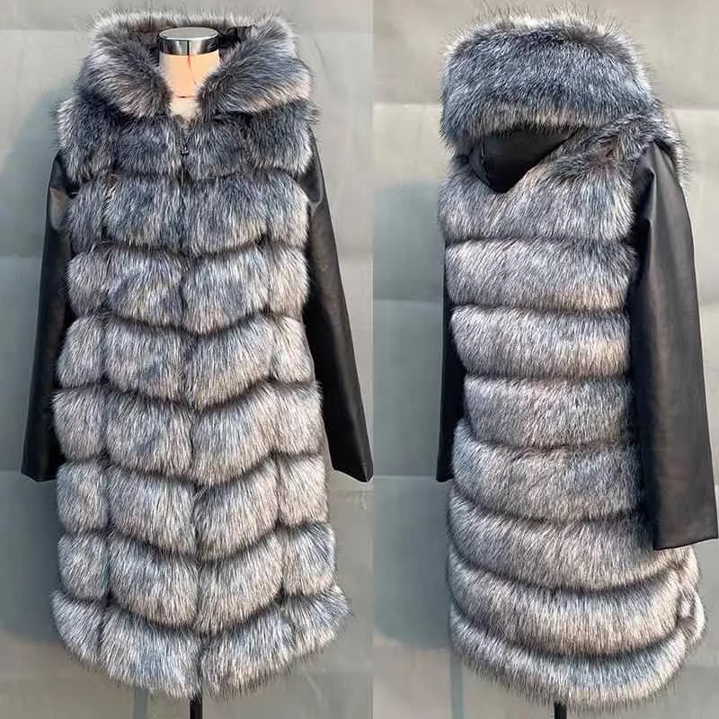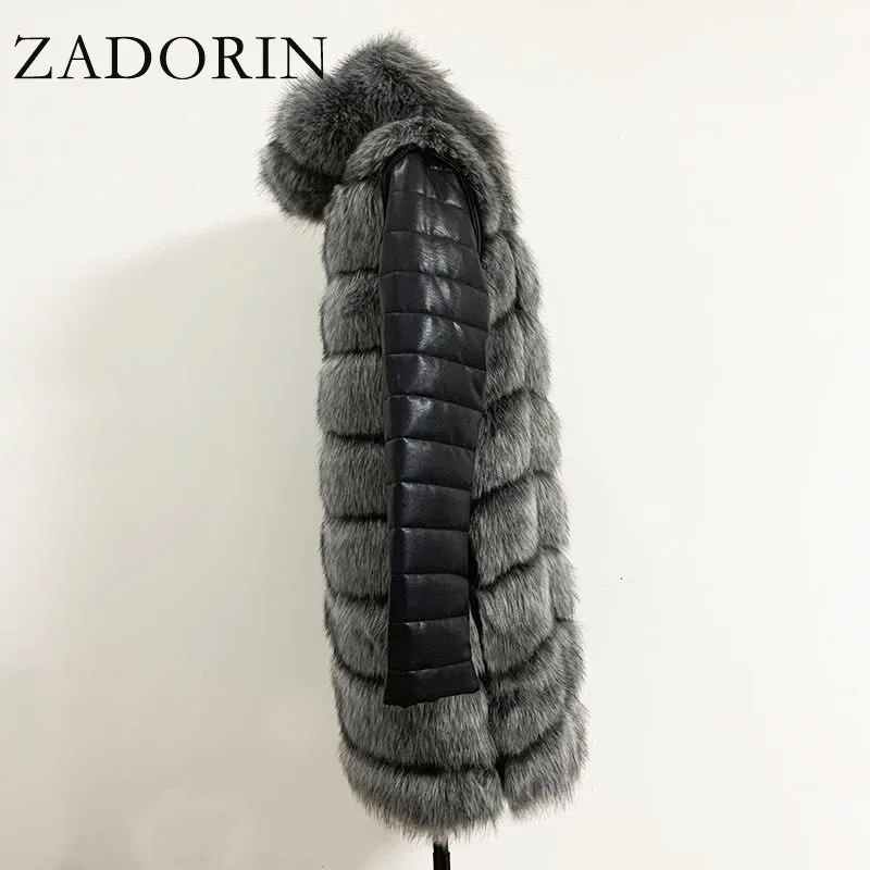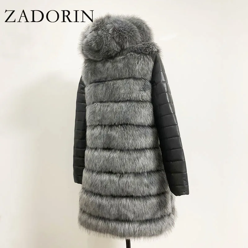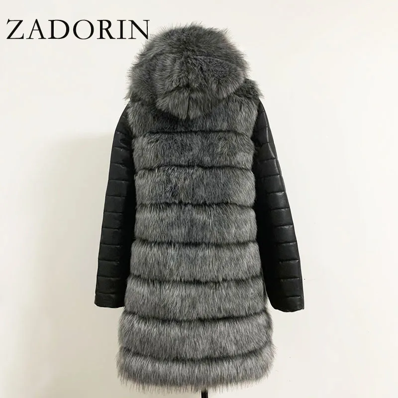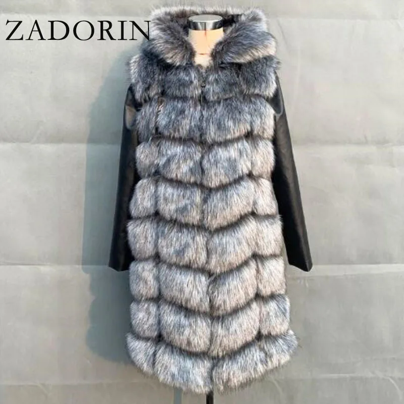 ZADORIN 90CM Winter Fluffy Warm Long Faux Fur Jacket Women Plus Size Leather Removable Sleeve Zipper Faux Fur Coat With Hooded