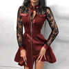 Zipper Pockets PU Leather Dress Women Sexy Lace Mesh Sleeve Patchwork Party Dress Winter Elegant Stand Neck Button Mini Dresses