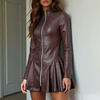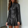 Zipper PU Leather Dress Long Sleeved Fashion Slim Fit Waist Cinching Street Stand Collar Cool Short Dresses Women’s Clothing