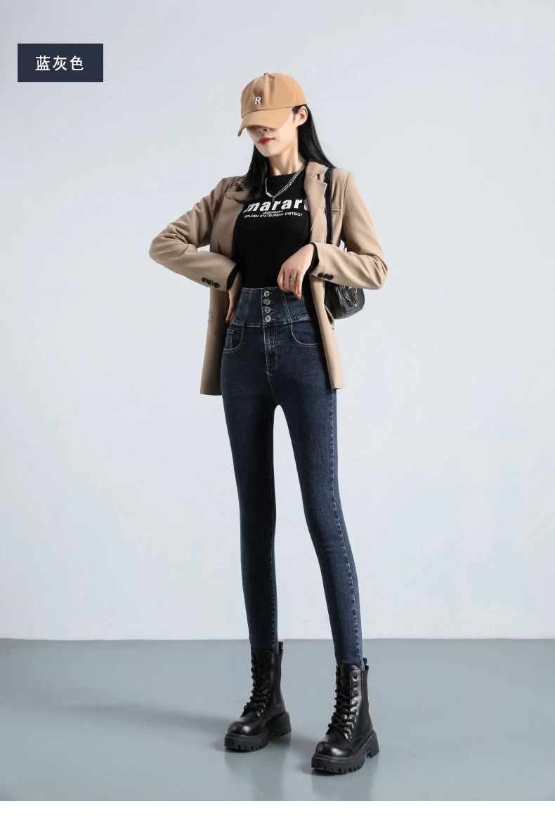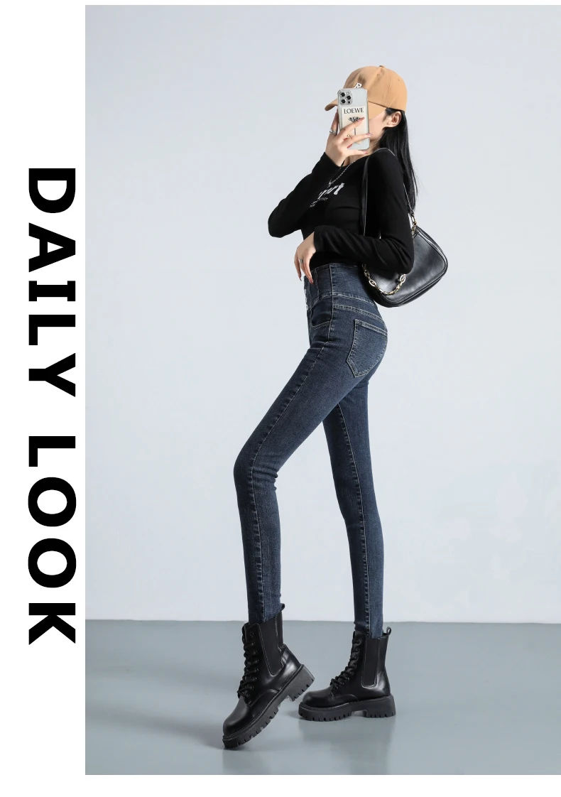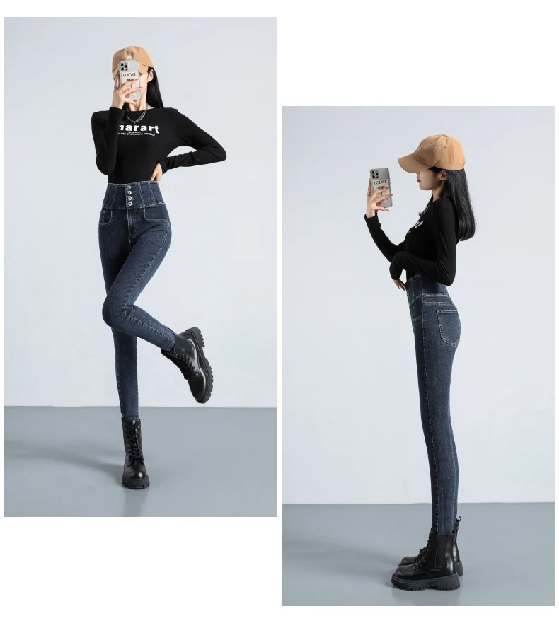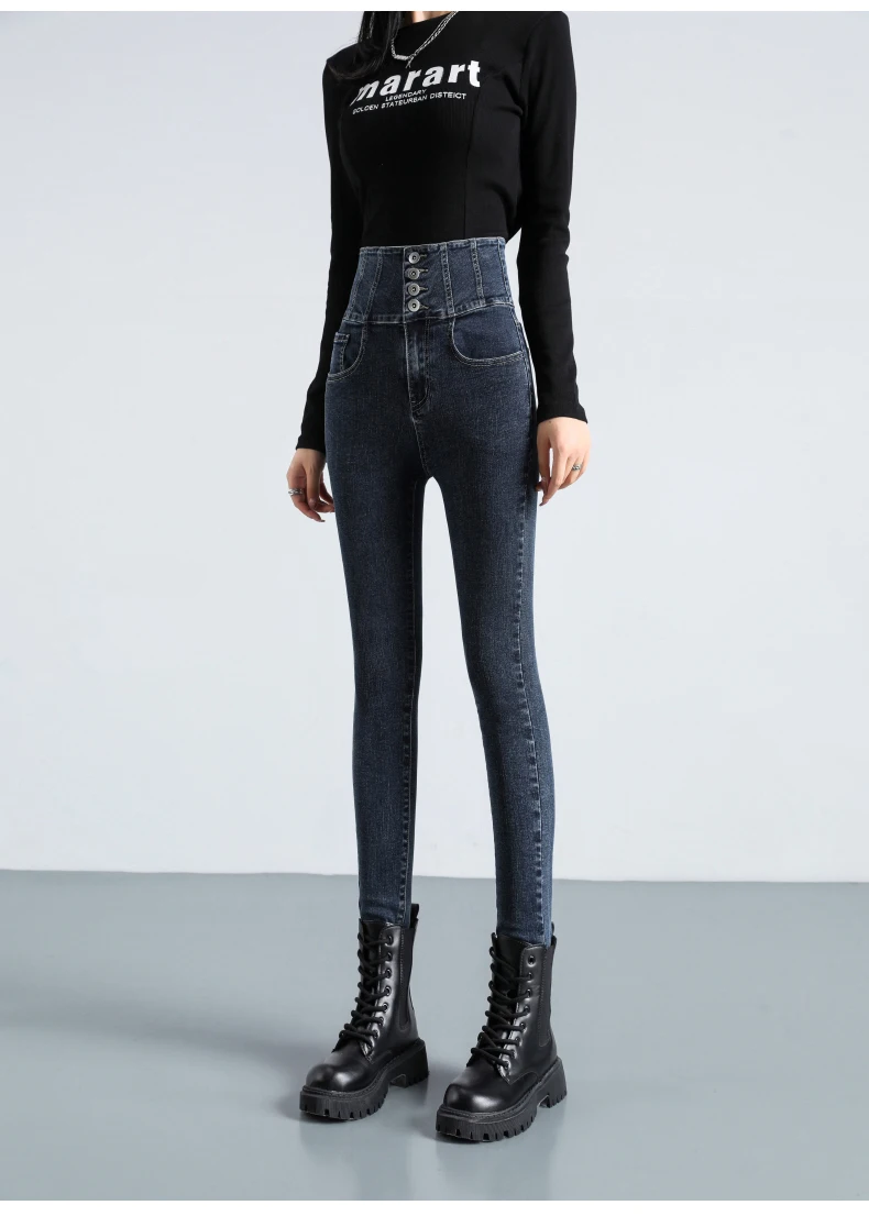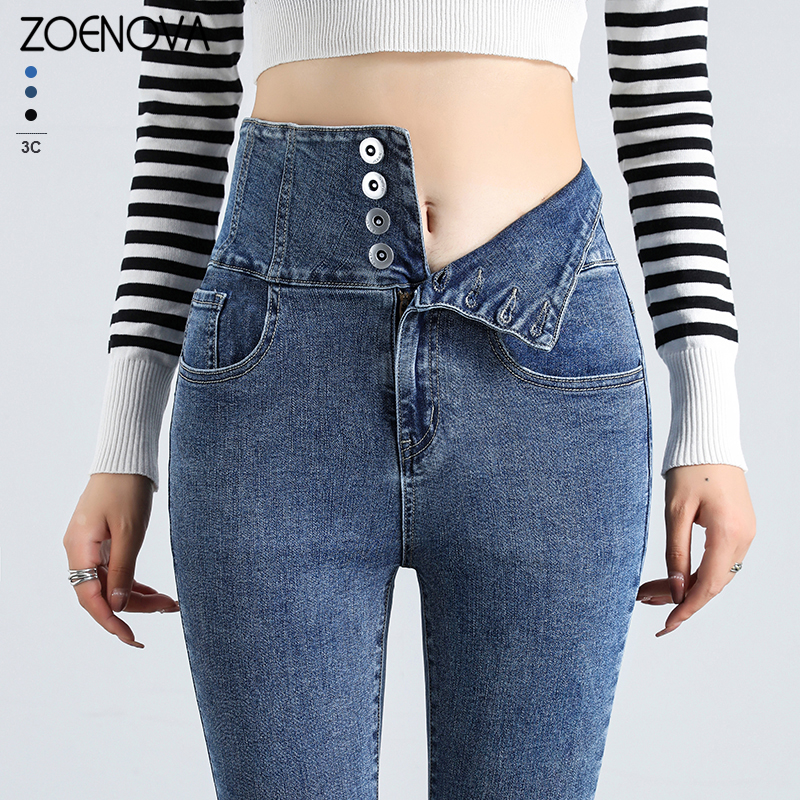 ZOENOVA Vintage Skinny Four Buttons Pencil Jeans Women High Waist Slim Fit Stretch Denim Pants Full Length Denim Tight Trousers