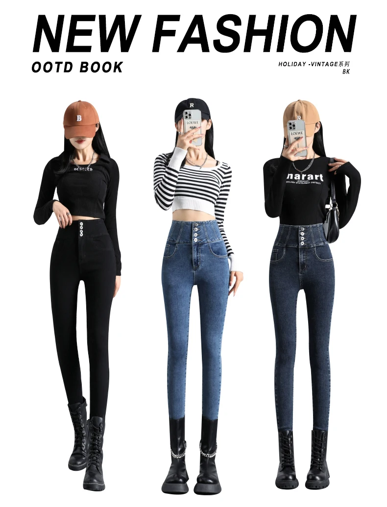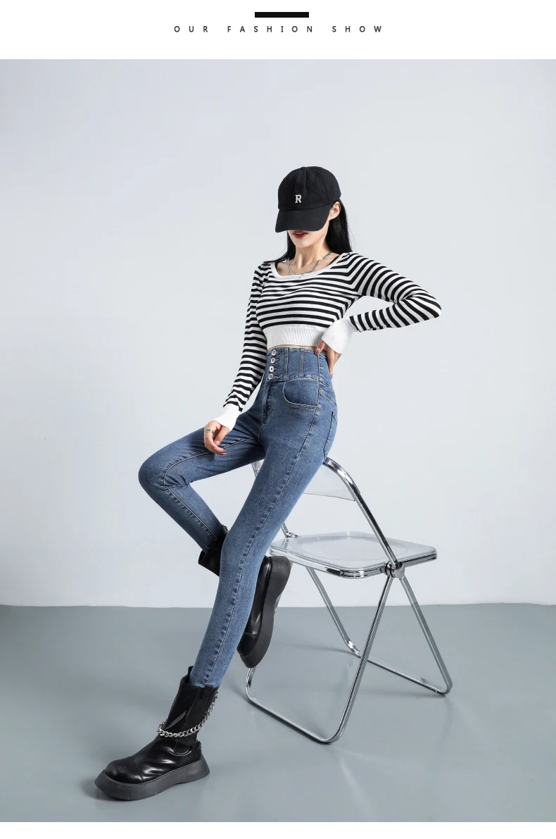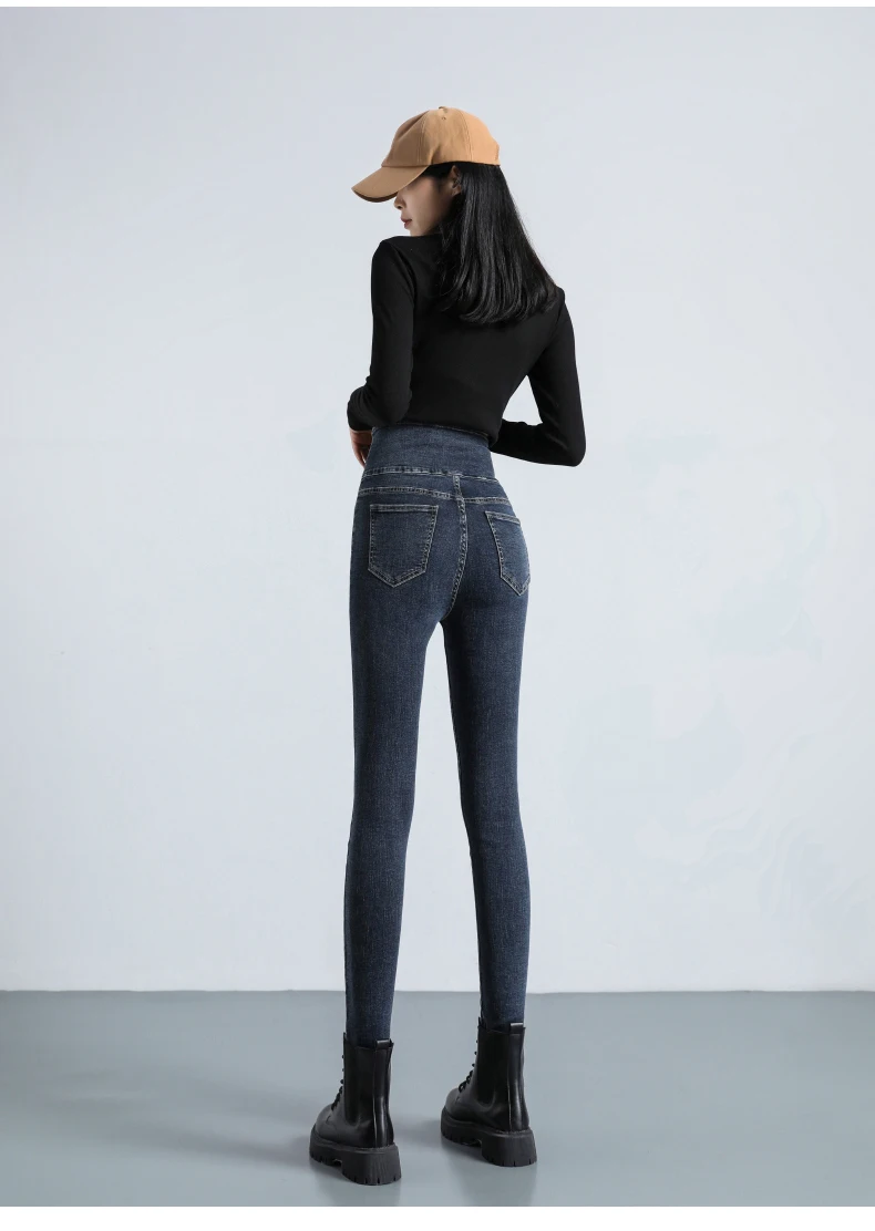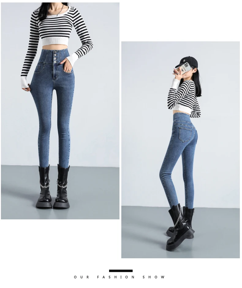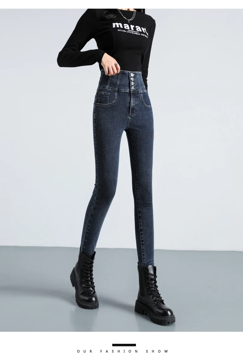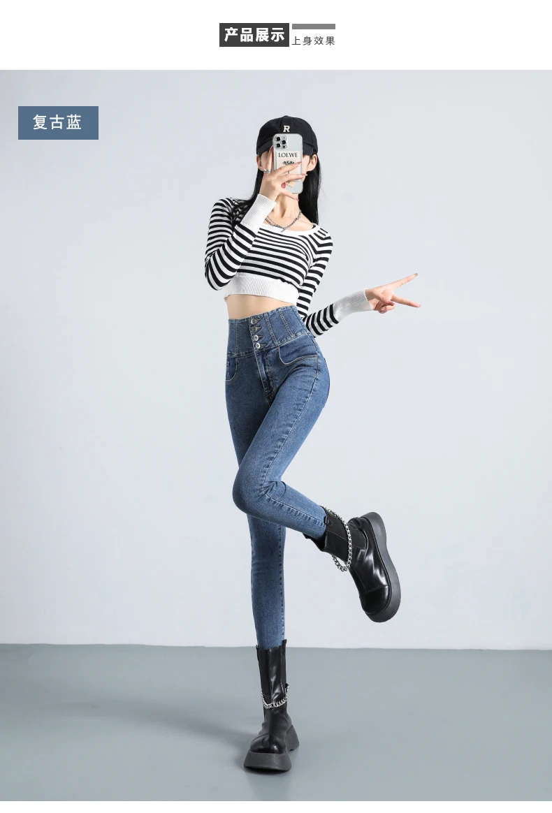 ZOENOVA Vintage Skinny Four Buttons Pencil Jeans Women High Waist Slim Fit Stretch Denim Pants Full Length Denim Tight Trousers