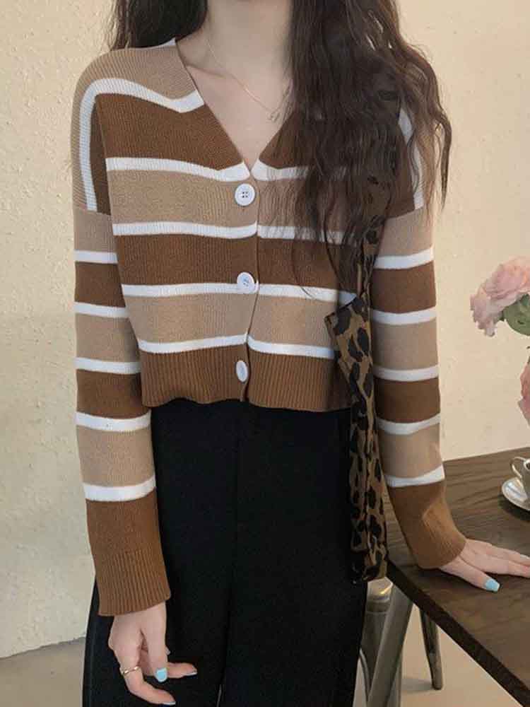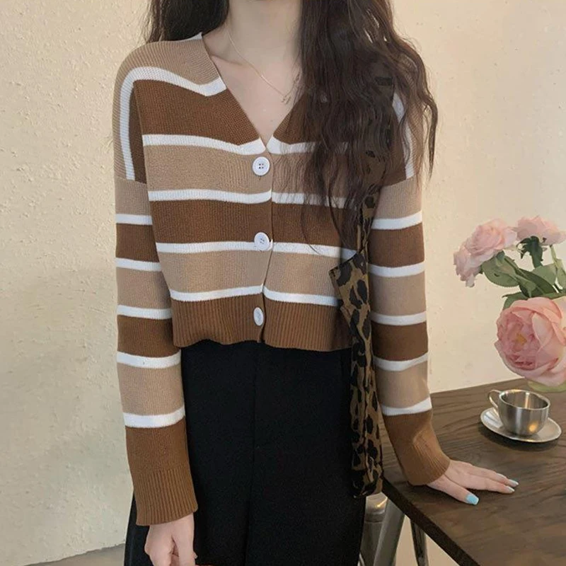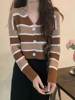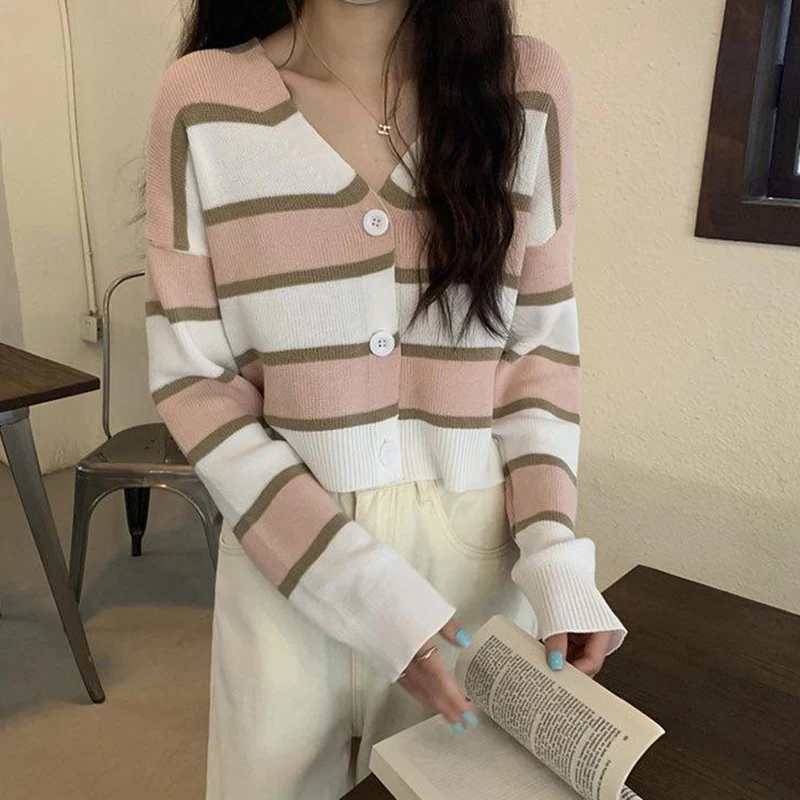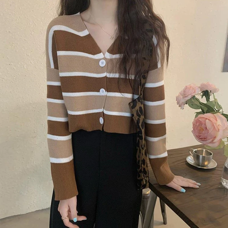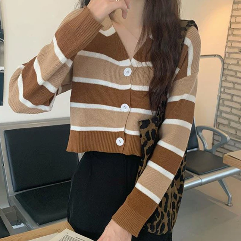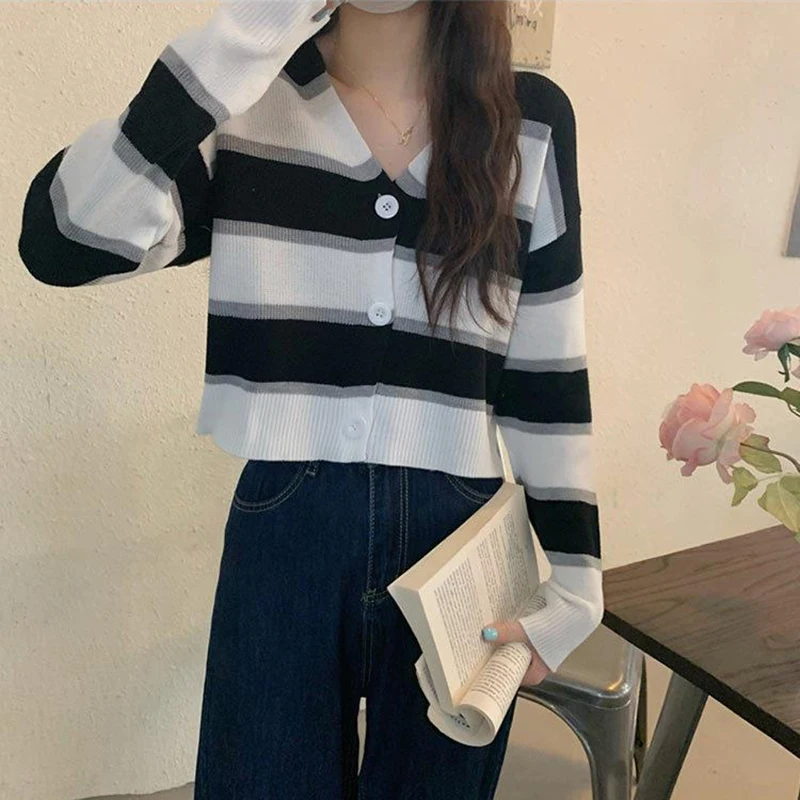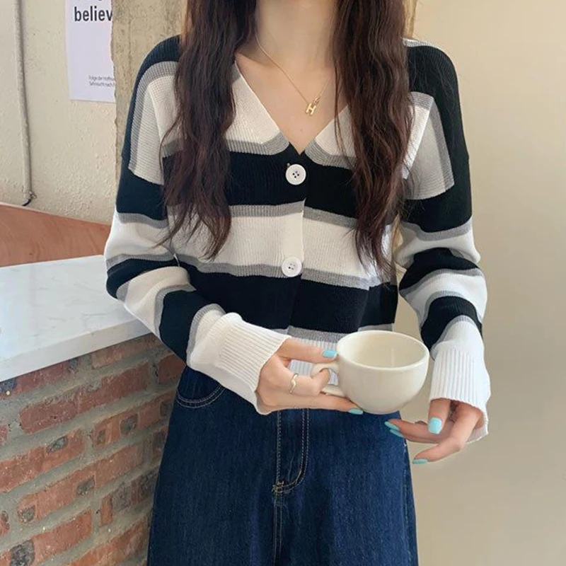 ZOKI Sexy V Neck Fall Women Knitted Cardigan Designed Striped Button Up Sweater Long Sleeve Korean Elastic Ladies Thin Coat