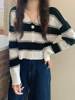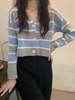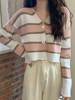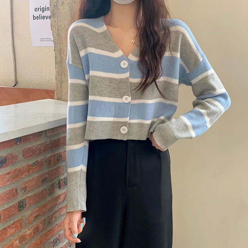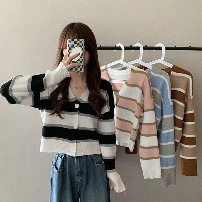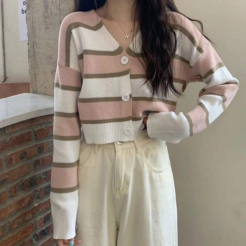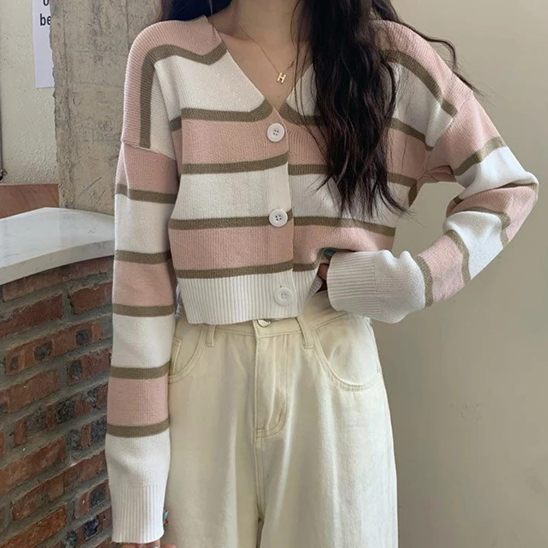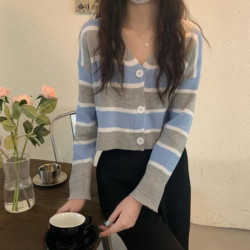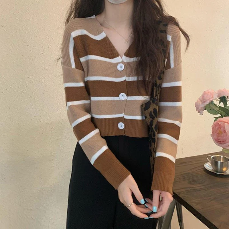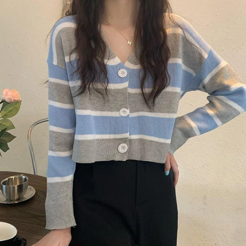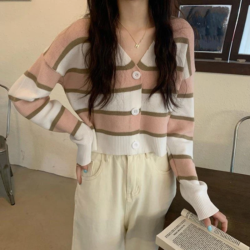 ZOKI Sexy V Neck Fall Women Knitted Cardigan Designed Striped Button Up Sweater Long Sleeve Korean Elastic Ladies Thin Coat