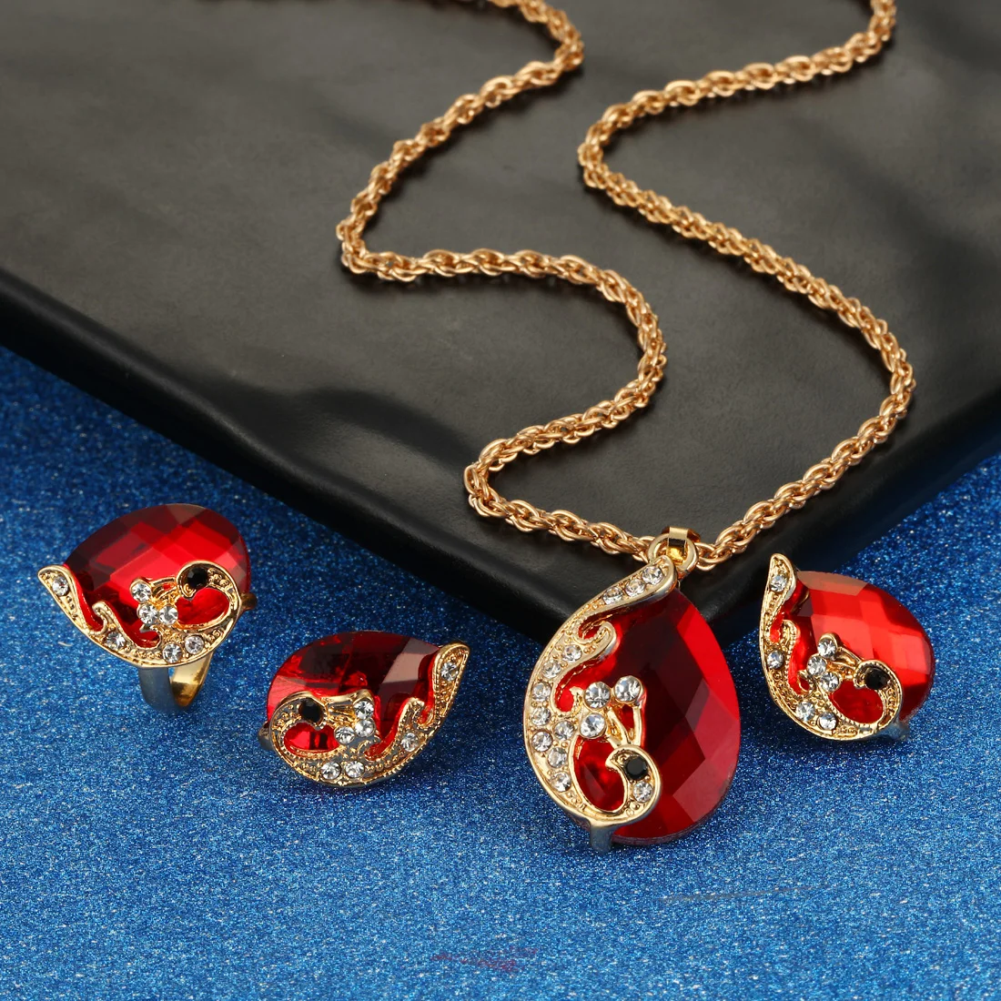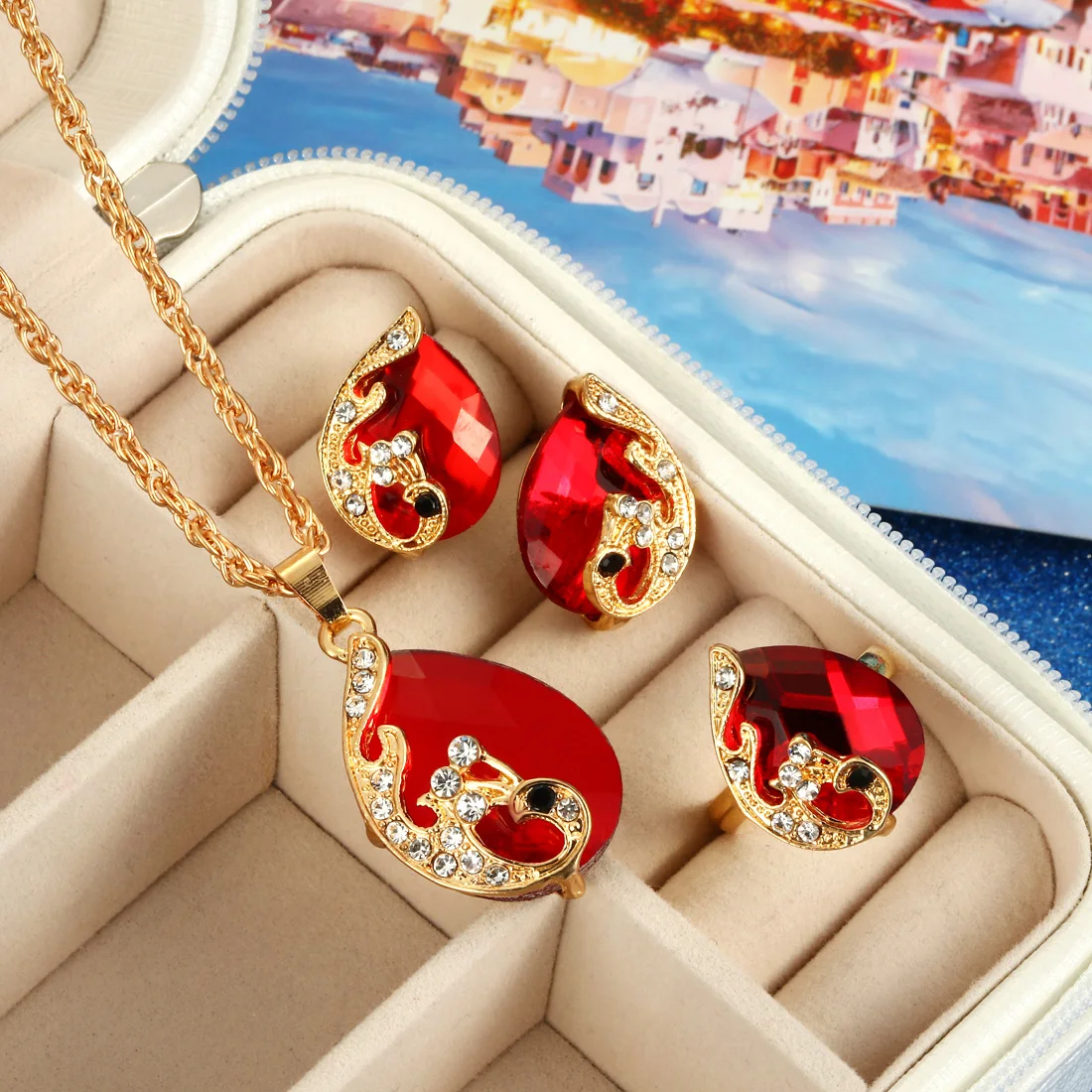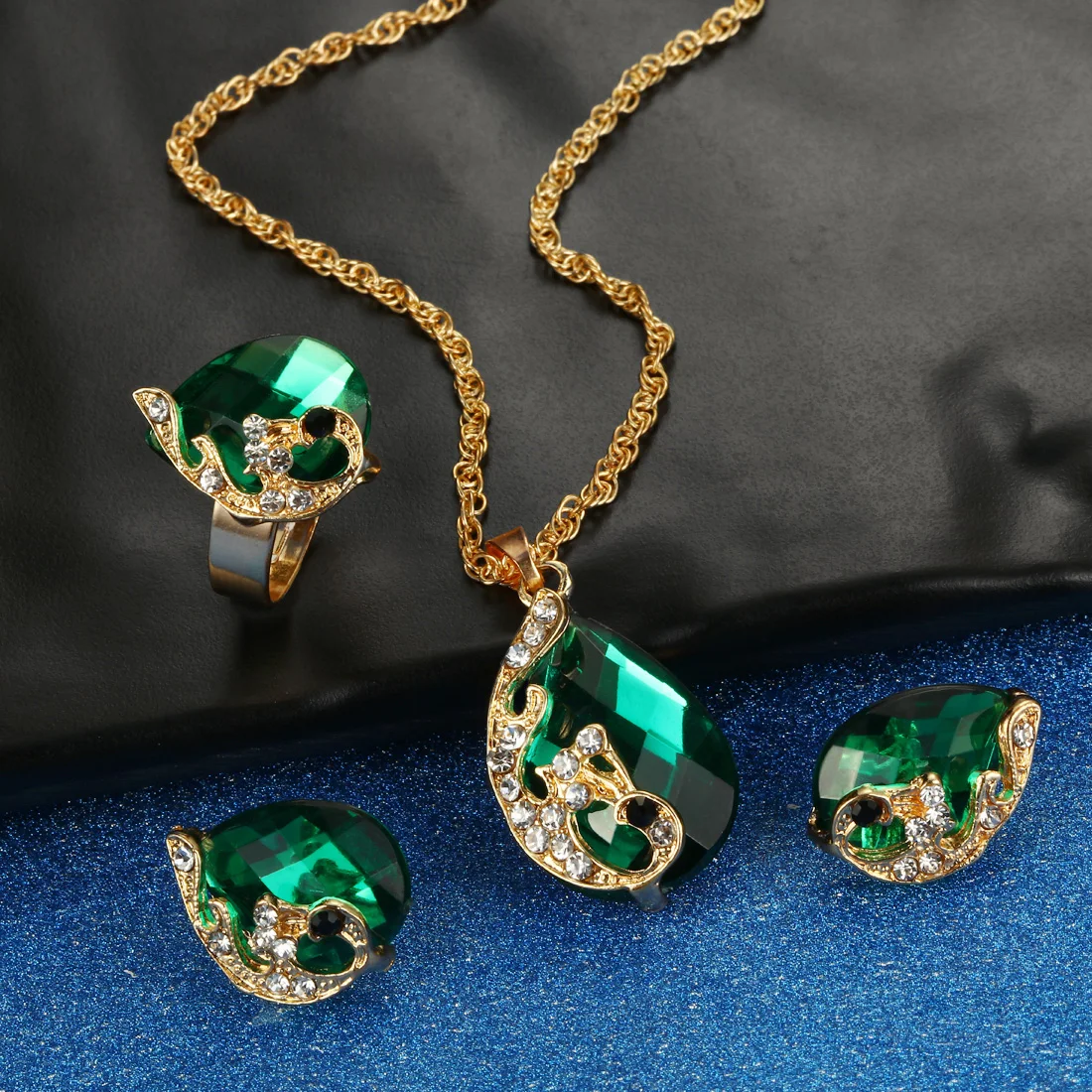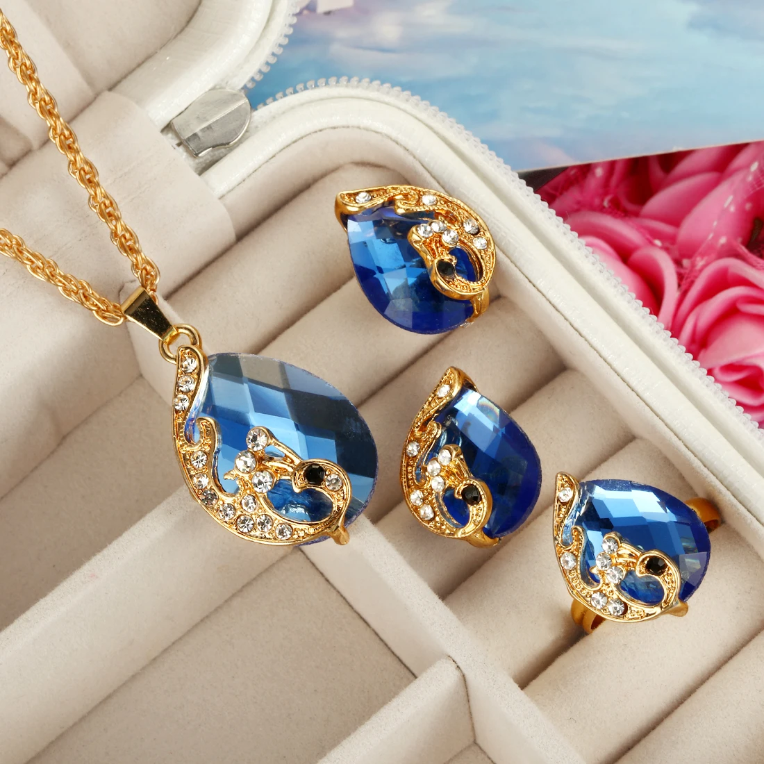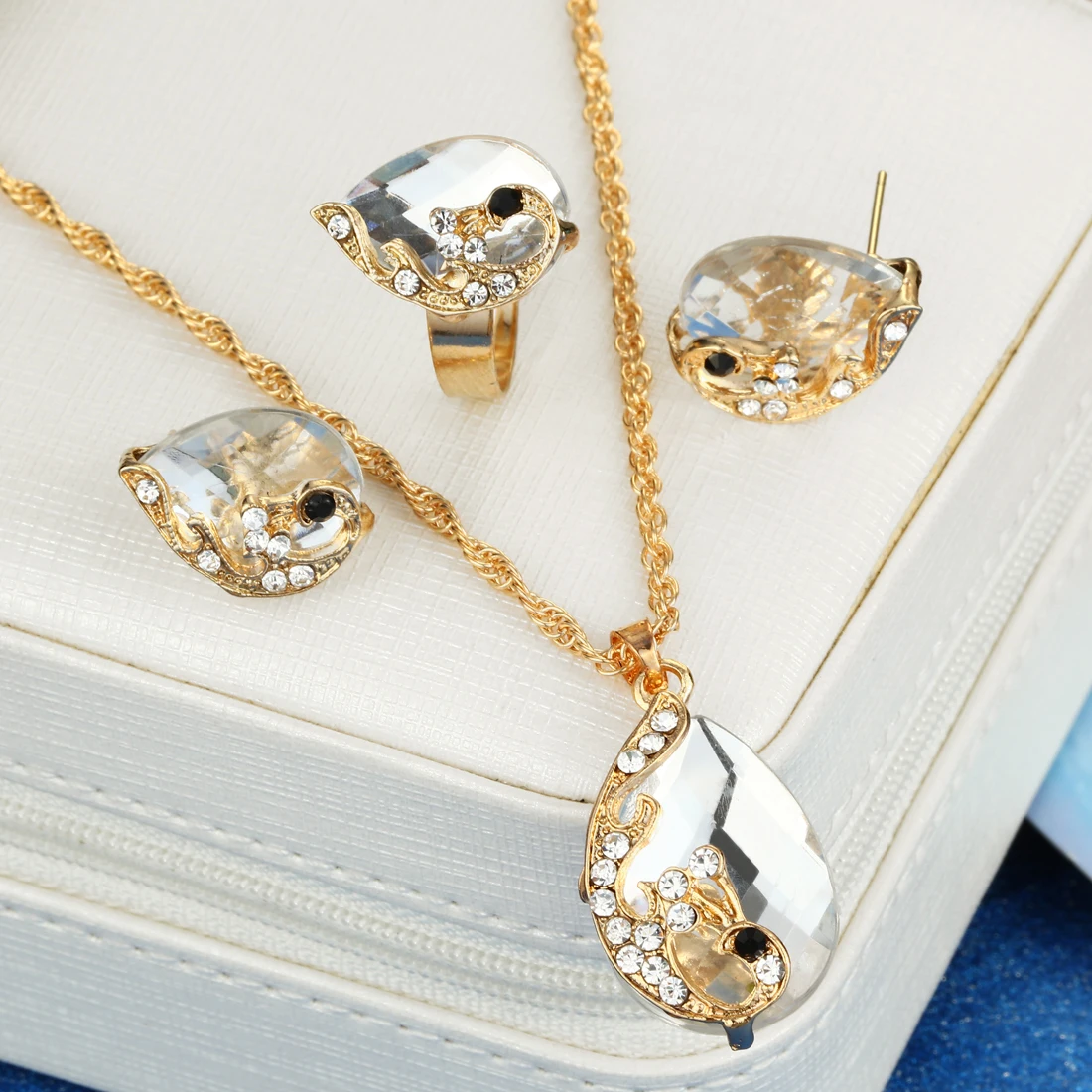 ZOSHI Wedding Jewelry Sets for Women Crystal Gold Chain Peacock Necklace Earrings Set Adjustable Rings 3pcs Jewelry Set